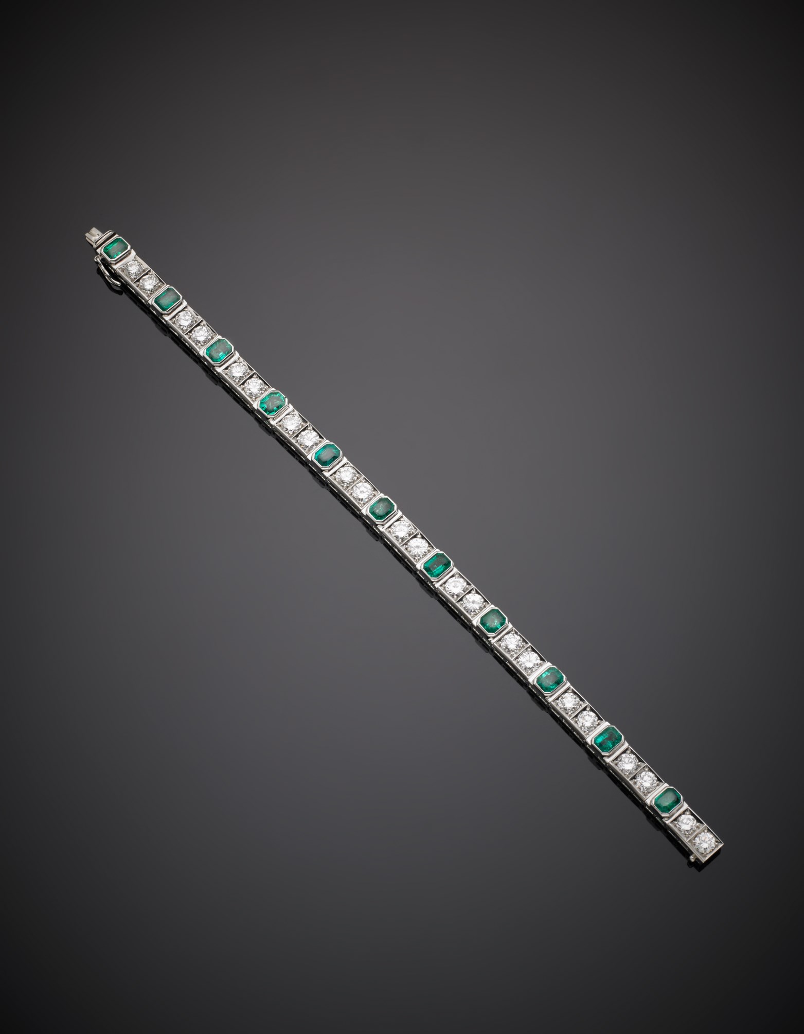 Bracciale in oro bianco con diamanti rotondi per complessivi ct 6 circa e smeraldi ottagonali per complessivi ct.4 circa, g. 23,70, lungh. cm 17,50 A white gold diamond and emerald bracelet