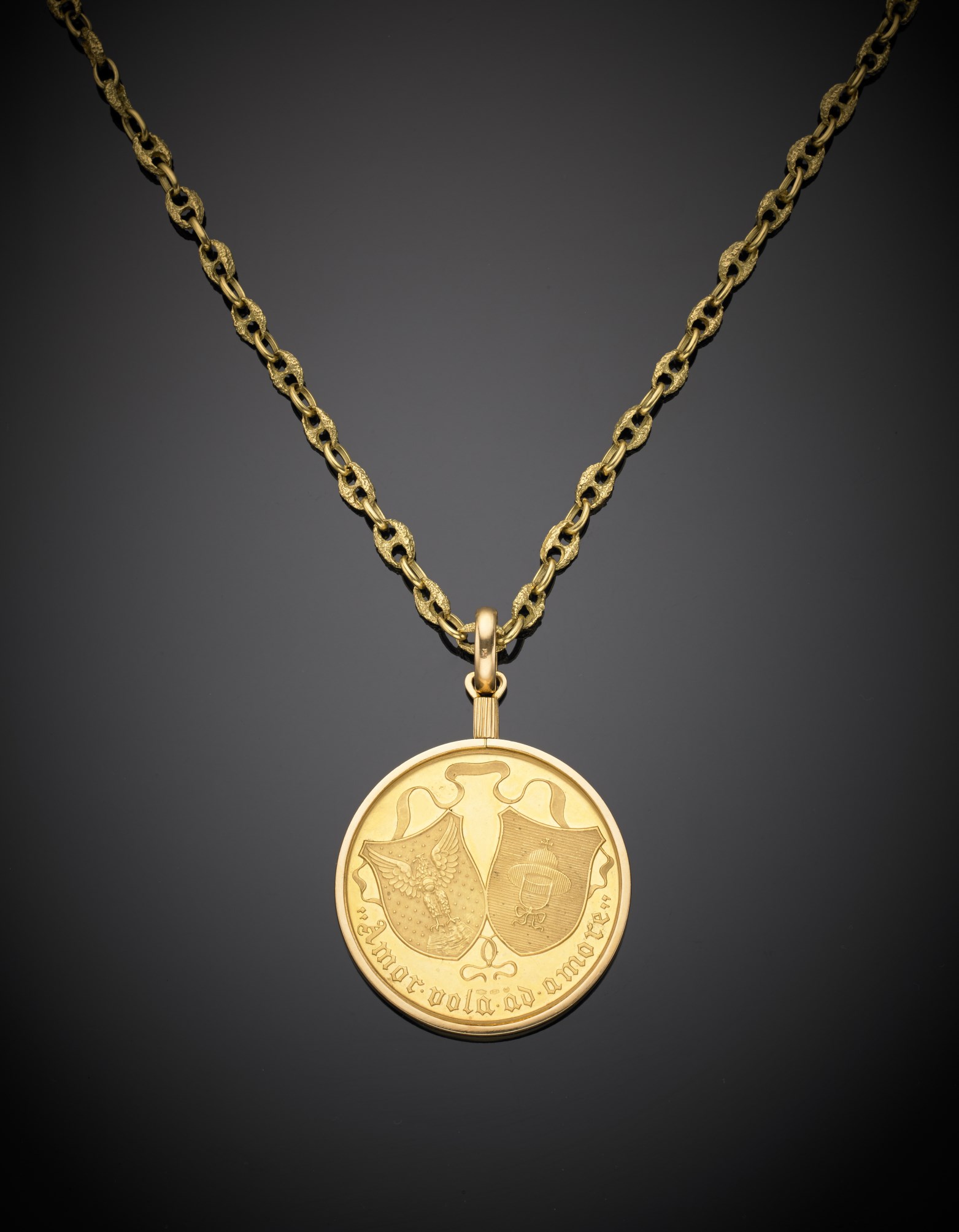 Catena marinara liscia e battuta con pendente a contenere una medaglia raffigurante Giulietta e Romeo, i casati dei Capuleti e Montecchi e la scritta "Amor vola ad amore". La medaglia UNOAERRE in oro 900/1000, g. 188,50, lungh. catena cm 90 circa Gold link chain with Romeo and Juliet medal