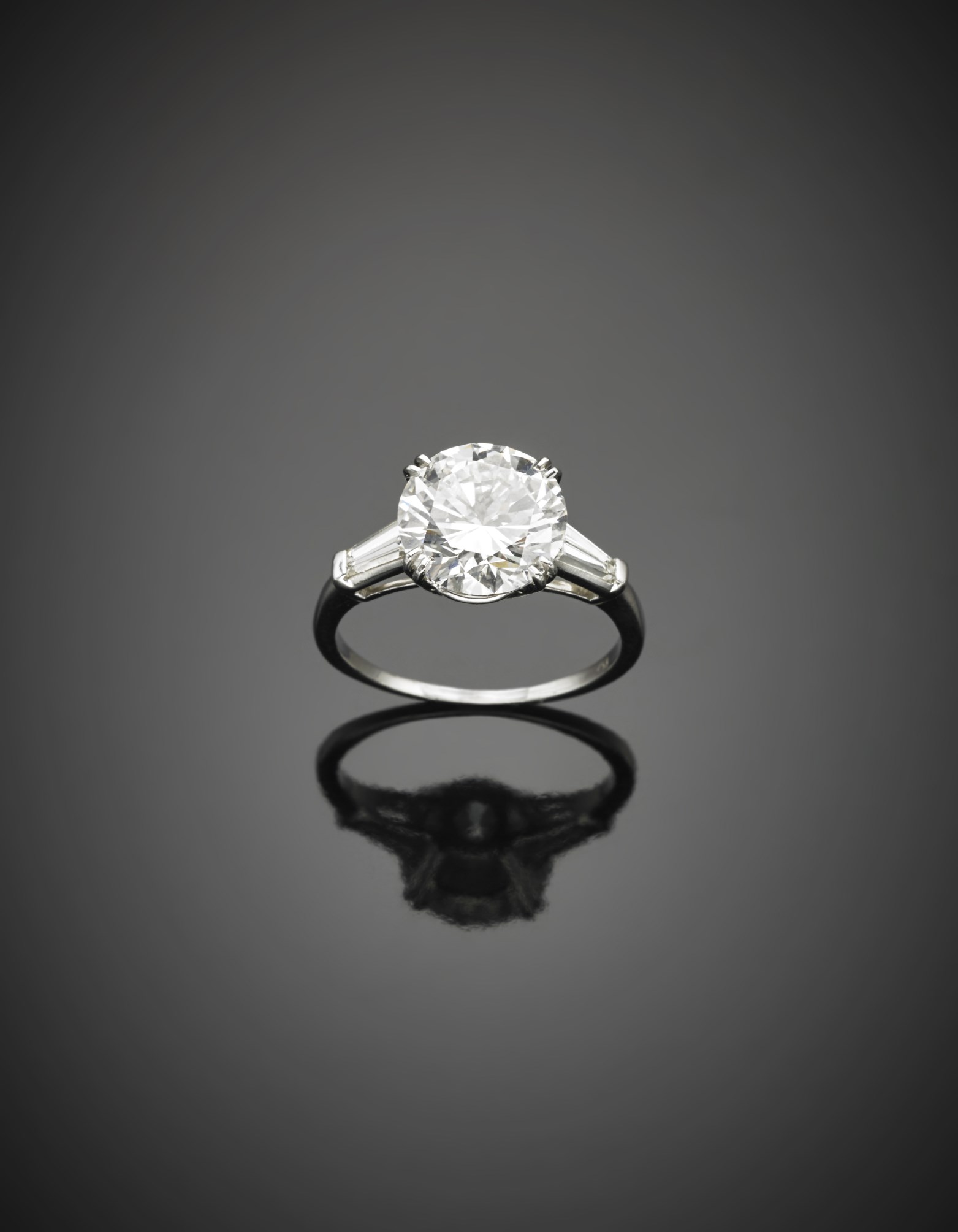 SABBADINI Anello in oro bianco con diamante centrale rotondo taglio a brillante moderno europeo di ct 4,75, accompagnato ai lati da due diamanti tapered g. 5, misura 19/59 Accompagnato da certificato gemmologico GIA n. 5364390 del 15/01/1992 SABBADINI White gold ring with a modern brilliant cut ct. 4,75 round diamond and tapered shoulders Appended with a GIA Certificate n. 5364390 15/01/1992