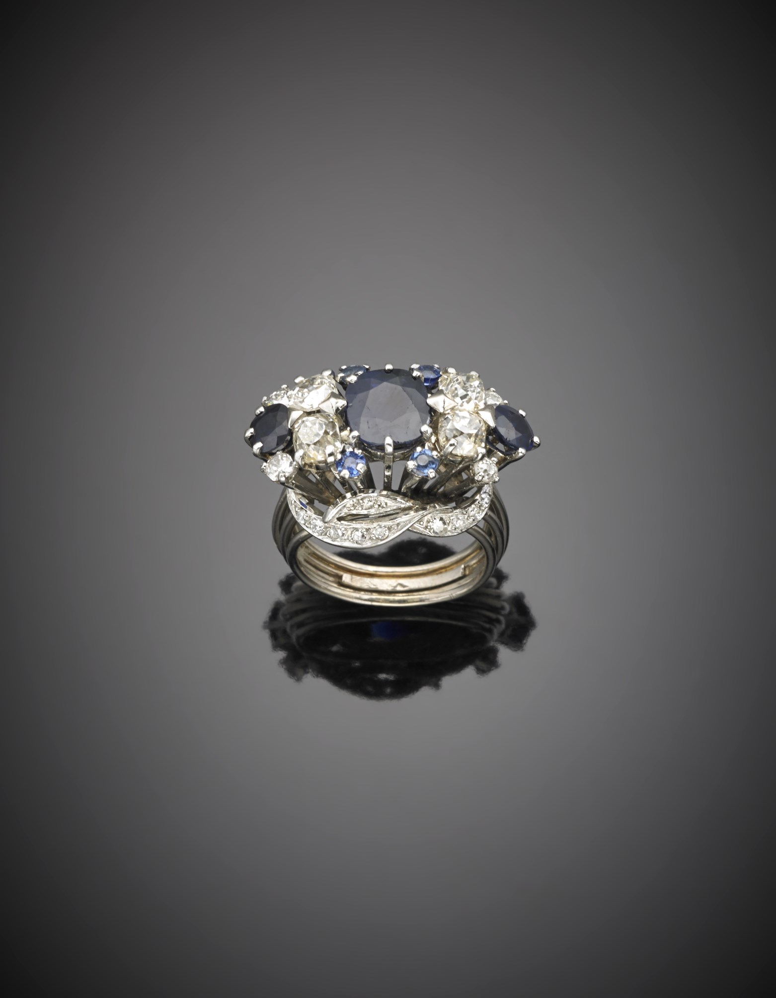 Anello in platino e oro bianco con diamanti rotondi e a cuscino come gli zaffiri, g. 13,40, misura 12/52 Platinum and white gold diamond and sapphire ring