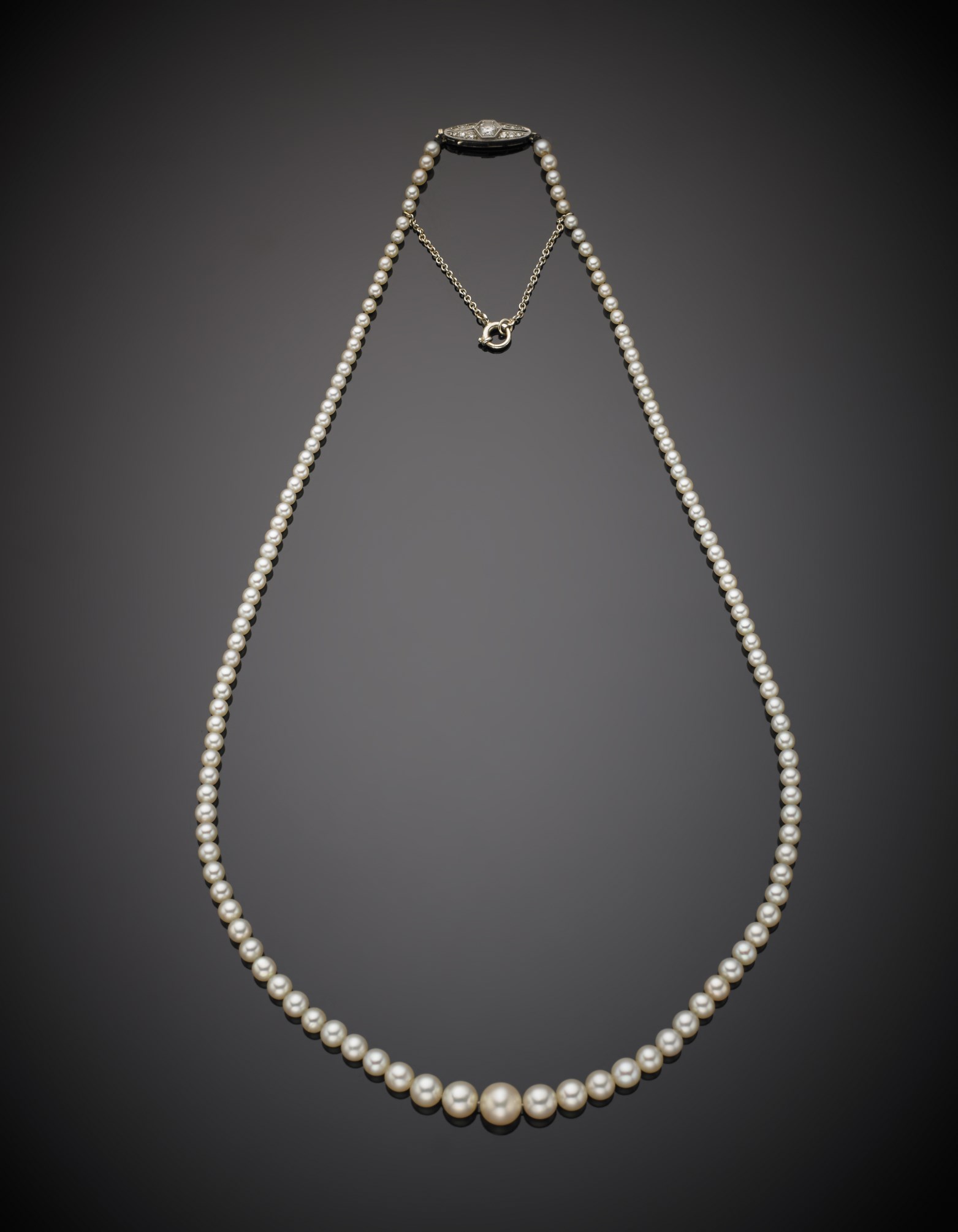 Collana di 129 perle naturali di acqua salata da mm 2 a mm 7 circa di colore bianco con chiusura in platino e diamanti g. 9,40 lungh. cm 44. Con astuccio originale U. Sauter Gold Schmield Basel Accompagnata da analisi gemmologica CISGEM report n. 3771 Milano del 01/07/2016 A single strand natural pearl necklace with platinum clasp. Original case U. Sauter Gold Schmield Basel Appended CISGEM jewellery certificate