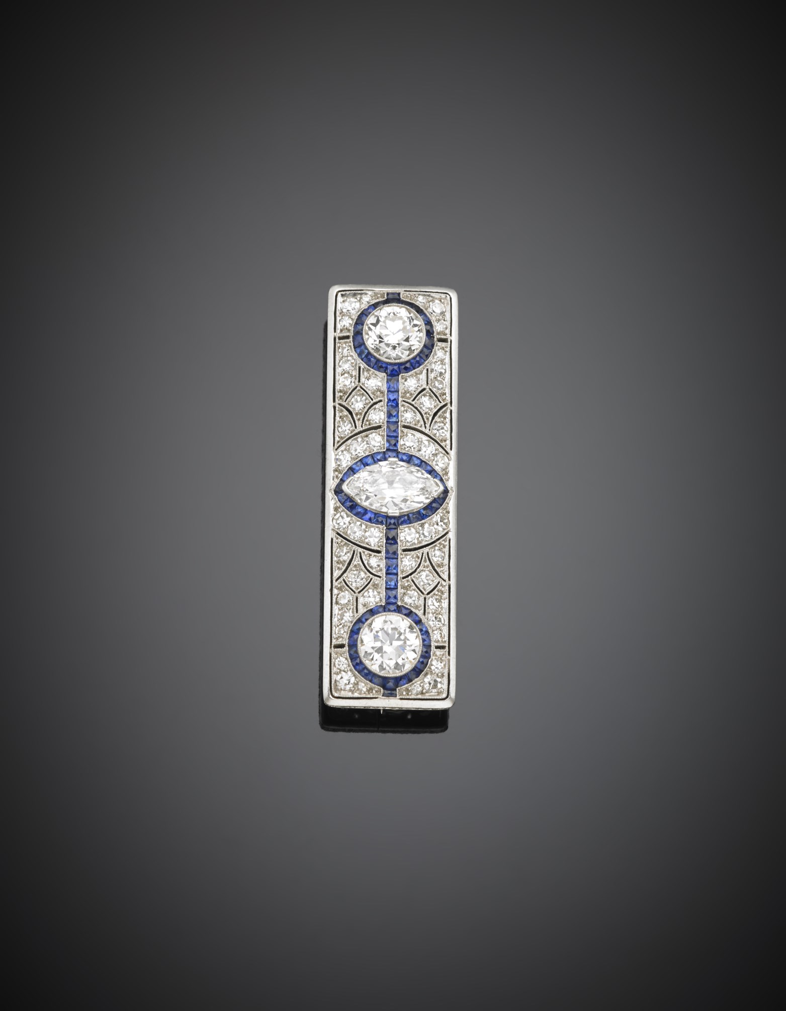 Spilla rettangolare in oro bianco e platino con al centro un diamante navette di ct 0,90 circa e due tondi ai lati di ct 0,80 circa ognuno, contornati da altri diamanti rotondi e zaffiri calibrè a rifinirla, g. 9,20, lungh. cm 4,20 A diamond brooch of which two round and a navette with a diamond and sapphire pavè surround