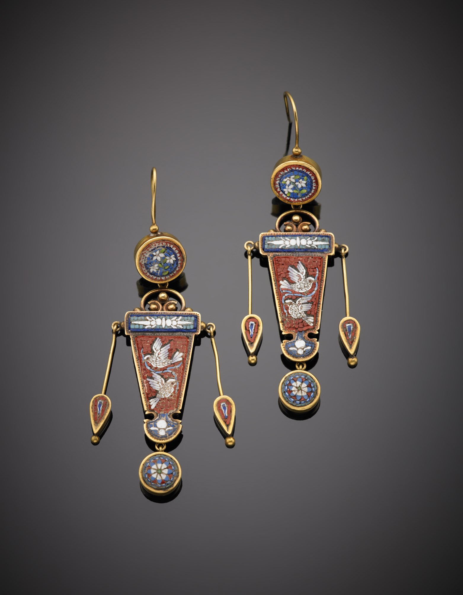 Orecchini pendenti in oro giallo con micromosaico a raffigurare le colombe della pace sui toni del mattone, bianco e dei blu g. 12,10 lungh. cm 6,70 circa Gold ear-pendants with micromosaic detail
