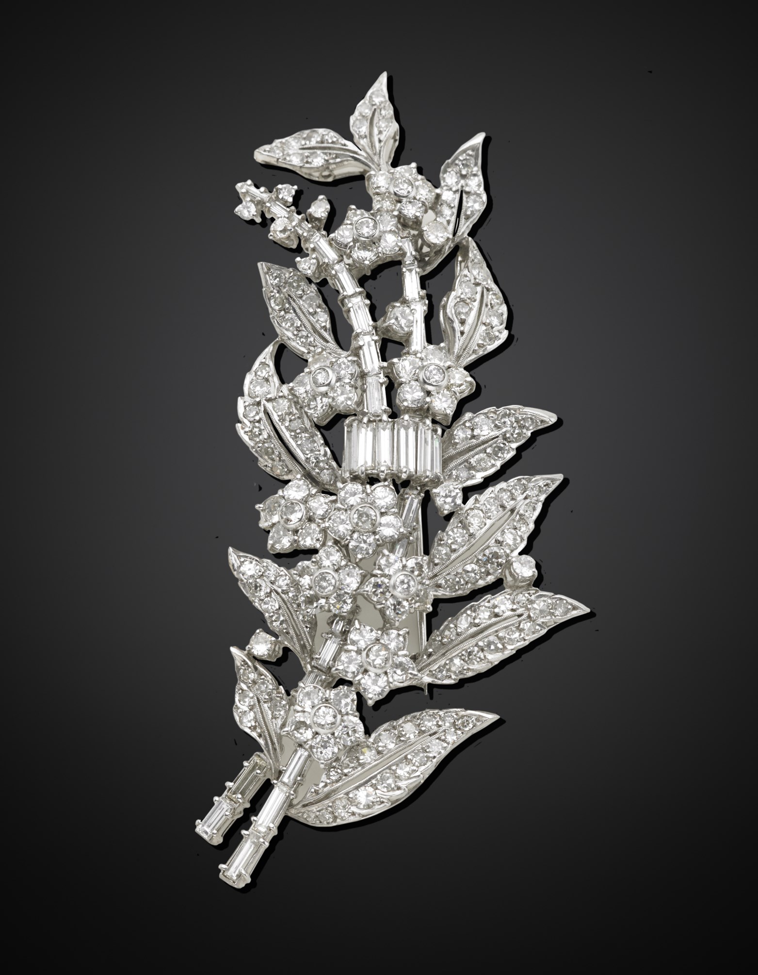 Spilla a motivo floreale in oro bianco con diamanti rotondi e baguette, g. 37,80 Floral white gold and diamond brooch