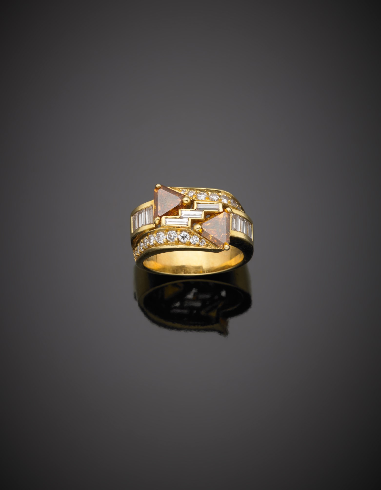 Anello in oro giallo con diamanti rotondi, baguette e due a triangolo di ct 0,70 circa l'uno orange-yellow fancy intense g. 10,70, misura 12/52 Accompagnato da certificato gemmologico del CISGEM n. 4205IAABIB del 19/09/2016 Milano A diamond and gold ring Appended CISGEM jewellery certificate