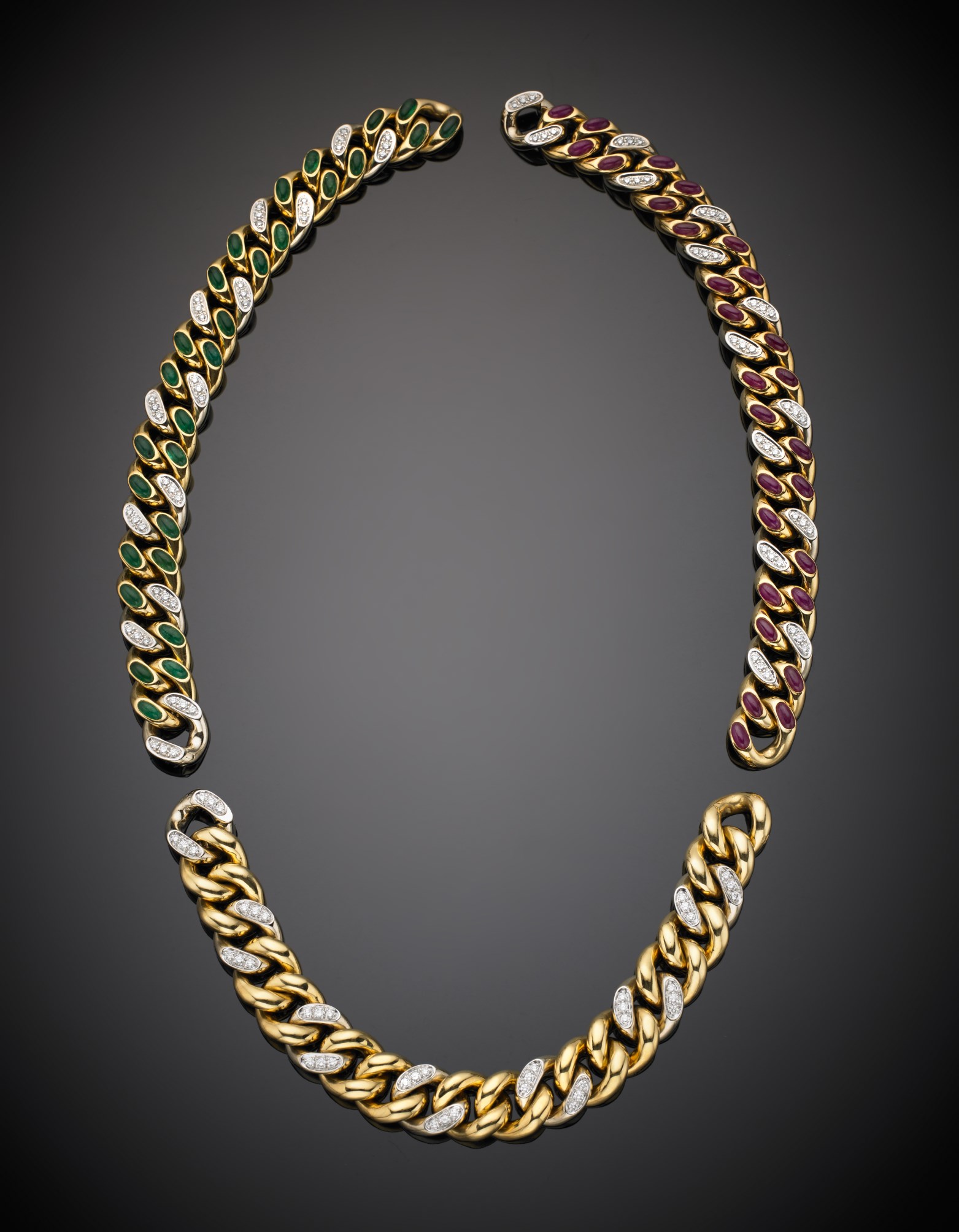 POMELLATO Lotto composto da tre bracciali in oro giallo e bianco con pavè di diamanti di cui uno anche con rubini e l'altro anche con smeraldi sempre ovali cabochon a segnare la maglia groumette. I tre bracciali si possono unire a formare un collier di lungh. cm 39 o una catena pi� lunga di cm 56, h cm 1,50 g. 314,20 Lot comprising three gold bracelets of which one with rubies and one with sapphires, which may be assebled to form a necklace