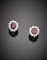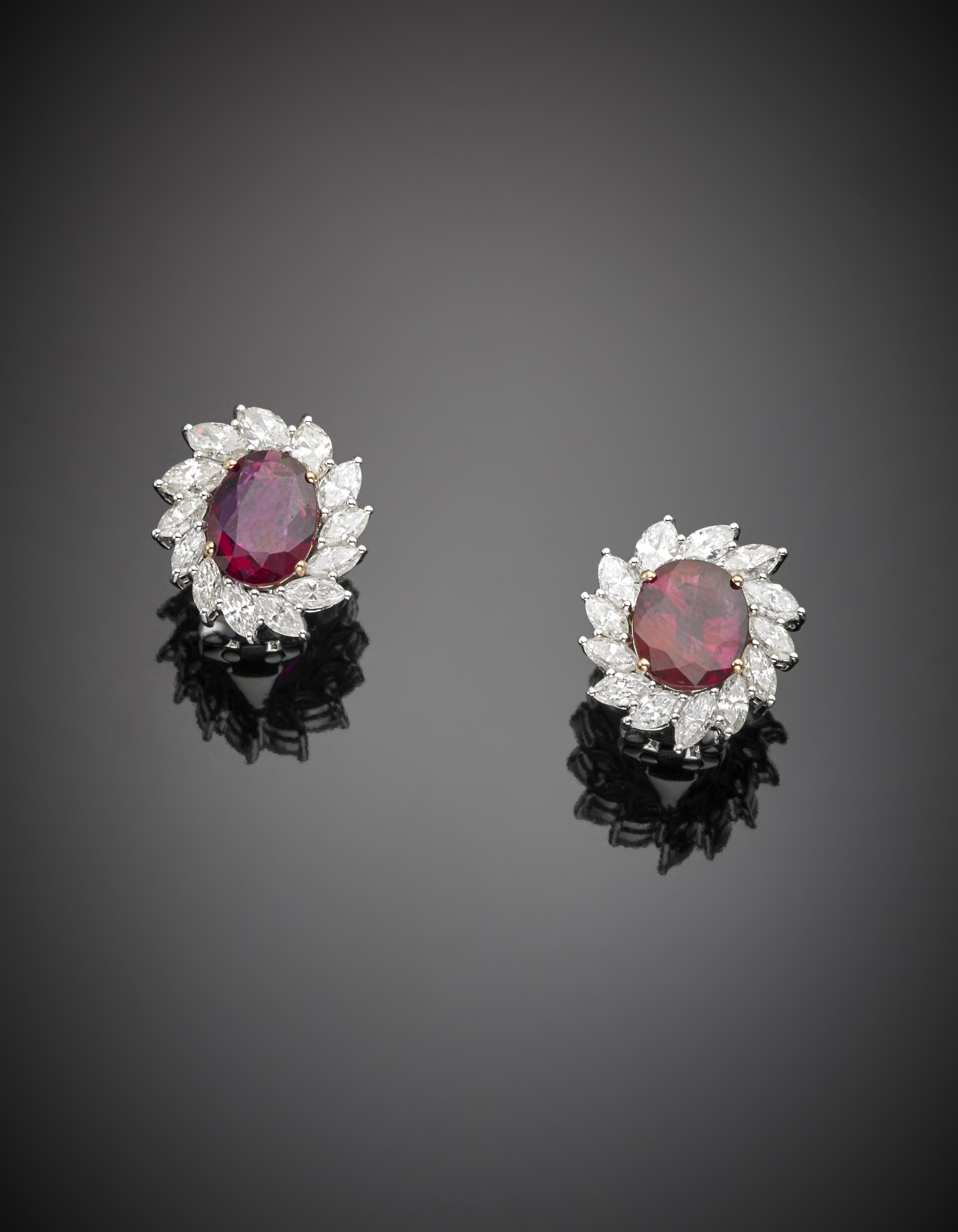 Orecchini in oro bianco con due rubini ovali taglio composito di complessivi ct 3,80 circa, contornati da diamanti taglio navette, g. 9,20 White gold diamond and ruby cluster earrings