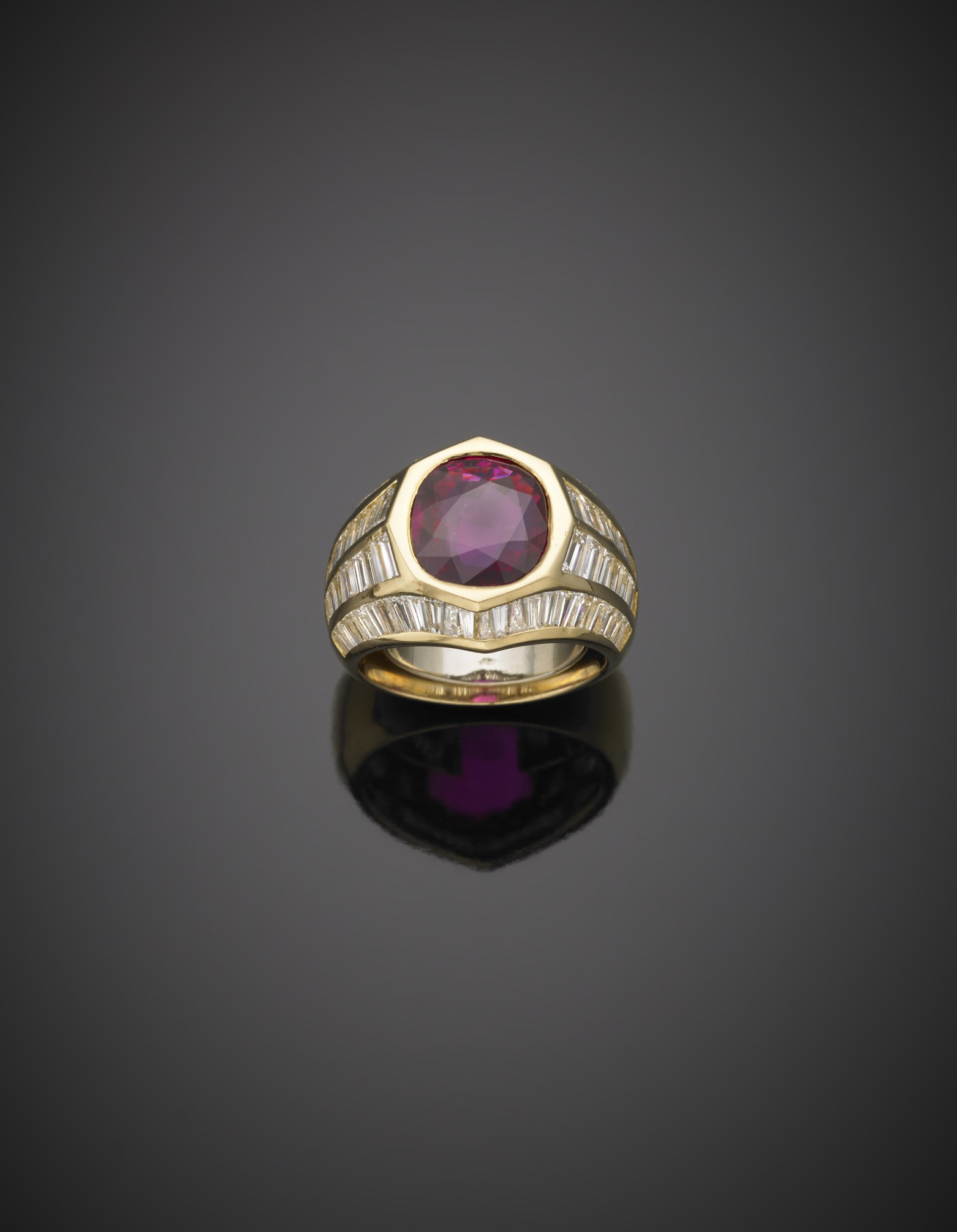 Anello in oro giallo con rubino centrale di forma cuscino, taglio composito di ct. 3,80 circa, contornato da diamanti baguette e tapered, g. 12,80, misura 11/51, con contranello in oro bianco Accompagnata da certificato gemmologico GCS nᄚ 5776-3636 del 23/11/2015 Londra, che certifica il rubino Tailandese, non si osservano evidenze da riscaldamento. Yellow gold diamond ring with a central, cushion cut ct.3,80 ruby Appended GCS Certificate n. 5776-3636 london 23/11/2016
