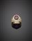 Anello in oro giallo con rubino centrale di forma cuscino, taglio composito...