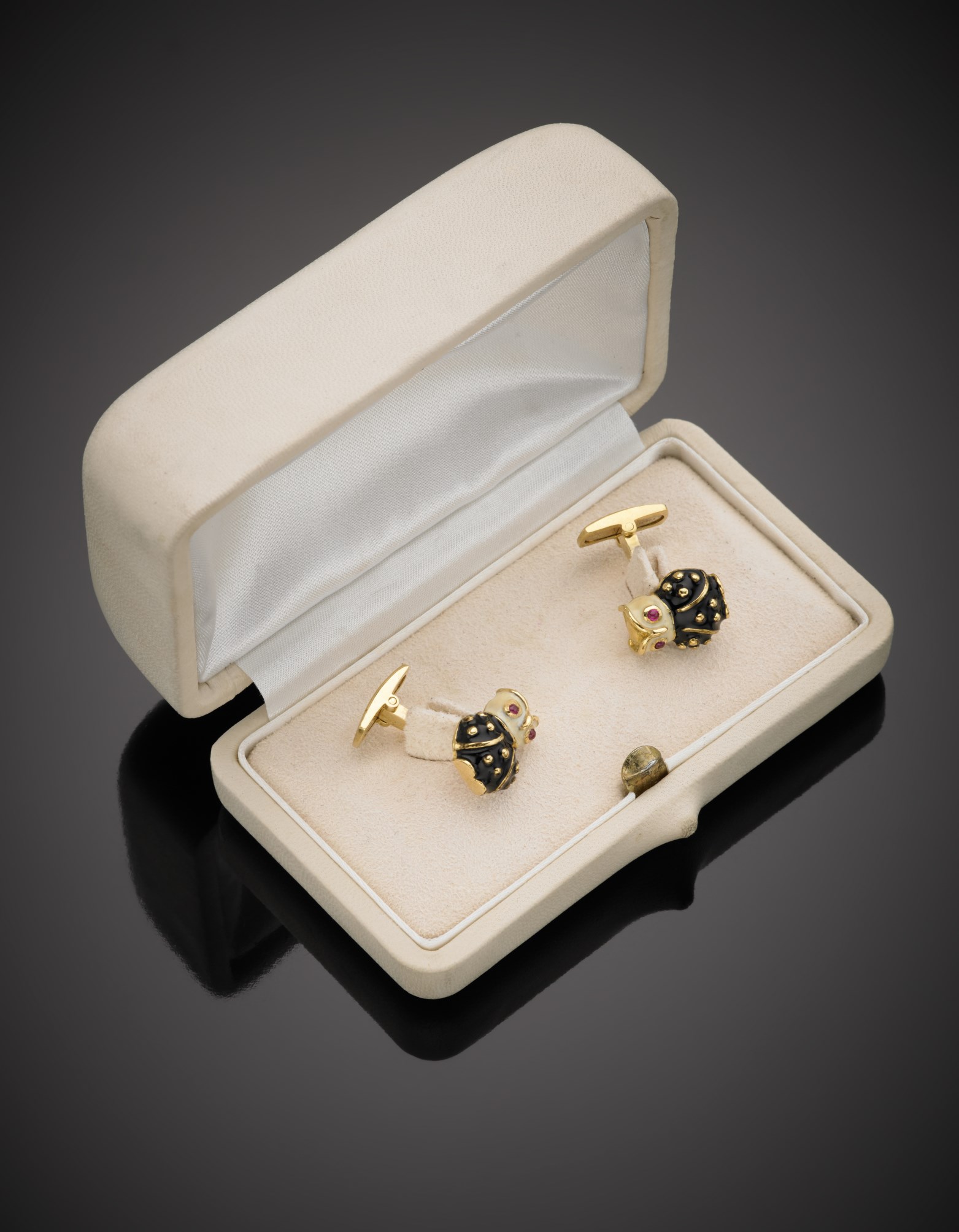 ANTORA' Gemelli in oro giallo e smalti a forma di civetta con occhi di rubini...