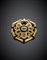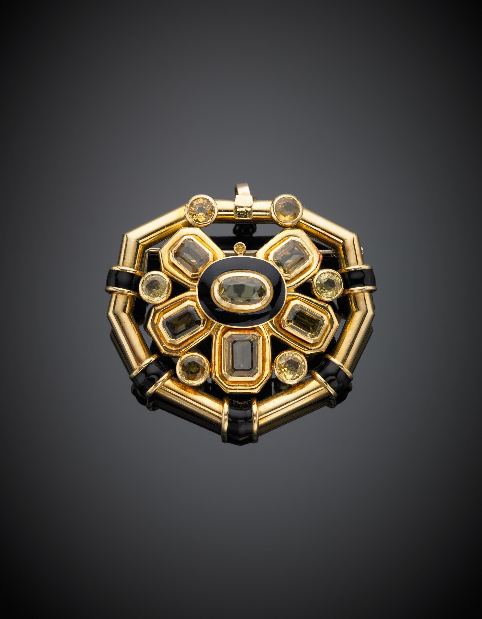 Grande spilla/pendente stilizzata in oro giallo quarzi citrini e smalto nero, g. 64,60, cm 5,8x5 circa, Citrine quartz, black enamel and gold brooch pendant