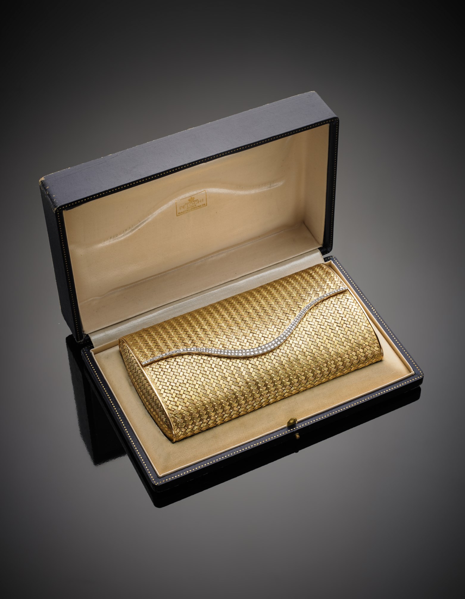 PETOCHI Clutch in oro giallo lavorato a cestino con diamanti nella chiusura e specchio all'interno, g. 367,70 lordi, lungh. cm 16,80, largh. cm 3,60, h cm 9,20. In scatola originale A basket weave gold clutch with a diamond motif, original box