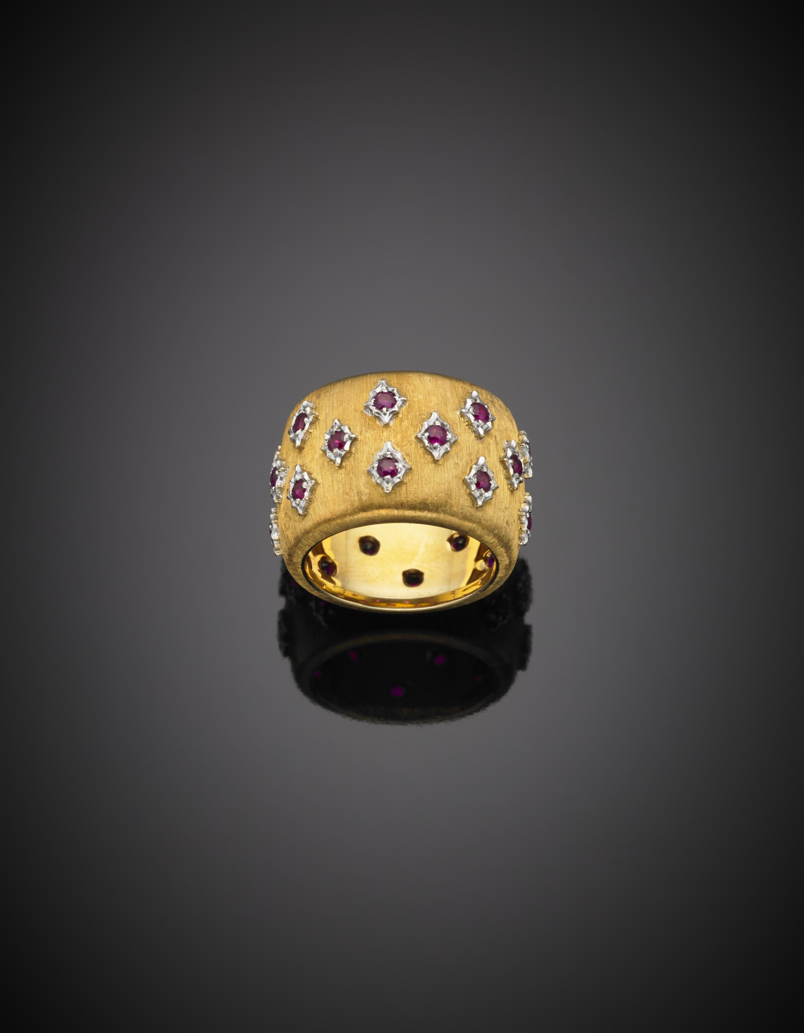MARIO BUCCELLATI Anello in oro giallo e bianco a fascia con rubini rotondi g....