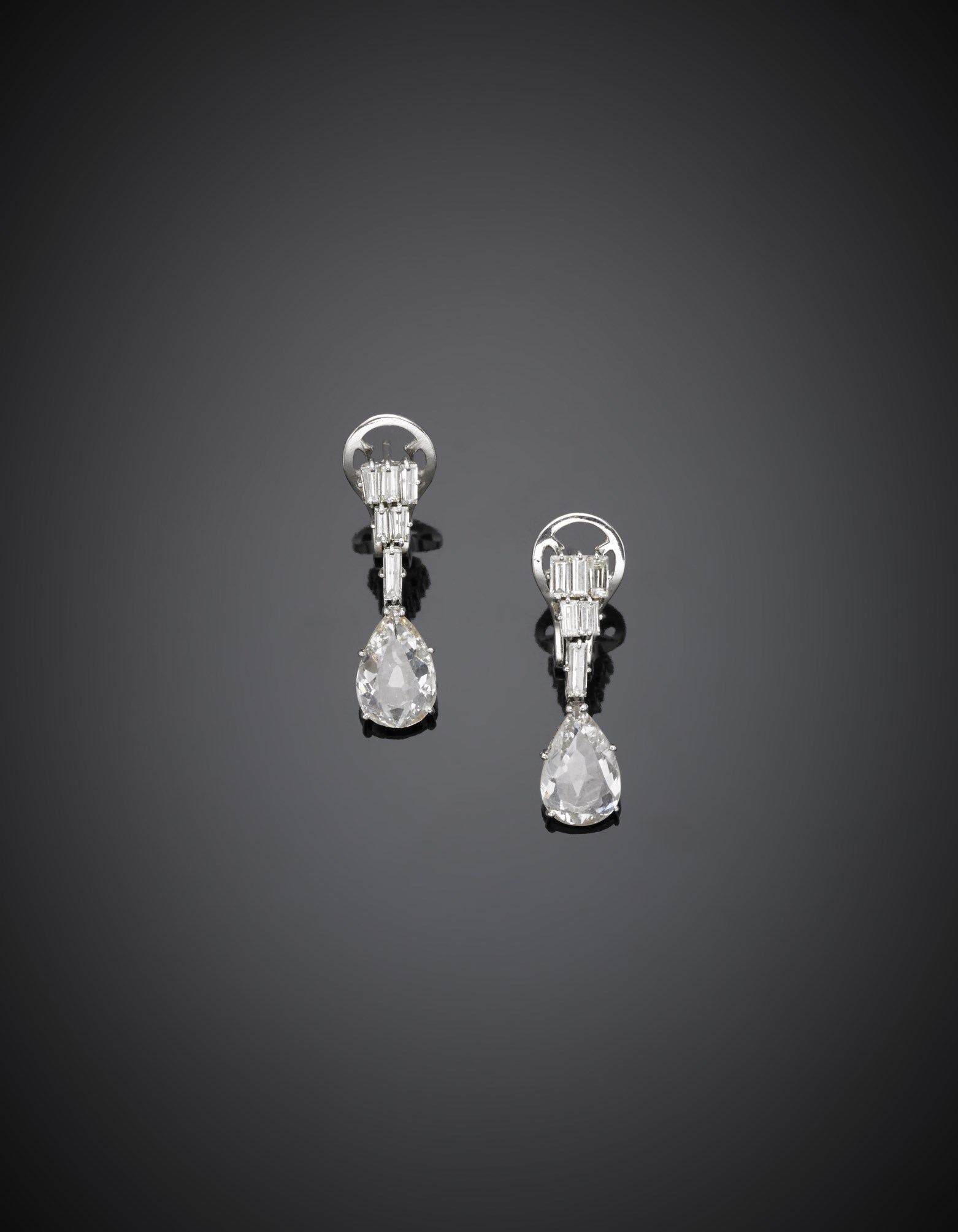 Orecchini pendenti in oro bianco con diamanti a baguette e terminati da due gocce di complessivi ct 2,25. circa, g. 5,50, lungh. cm 2,40 circa. In scatola originale