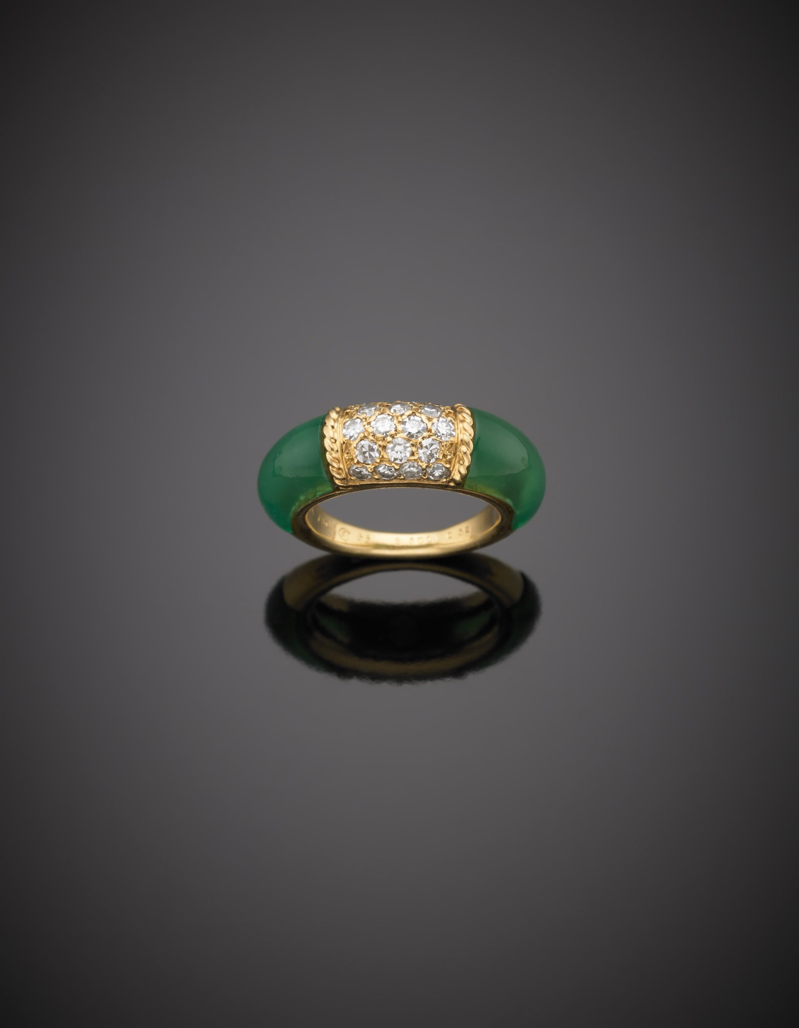 VAN CLEEF & ARPELS Anello in oro giallo e quarzo microcristallino verde e diamanti, punzonato VCA B 5001, g. 6,90, misura 9/49 Quartz, diamond and gold ring