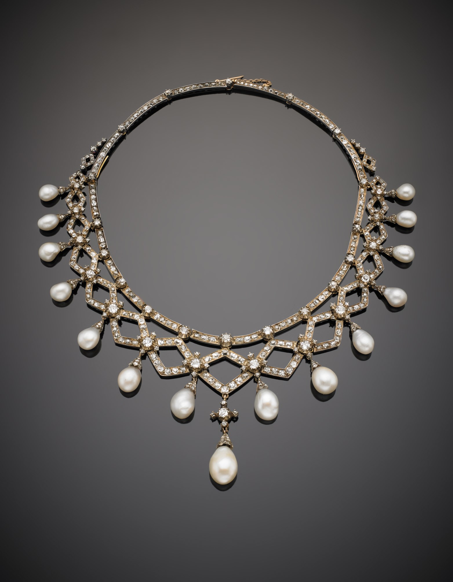 Collier in oro rosso e argento, con 15 perle naturali bianche d'acqua salata a goccia, degradanti verso il centro, rifinito con diamanti, g. 80,40. Punzoni francesi: cigno, gufo e aquila Accompagnato da certificato gemmologico nᄚ 05026 The Gem & Pearl Laboratory, 16 Dicembre 2011 Londra Red gold and silver diamond necklace with fifteen degrading natural salt water pearl drops Appended Jewellery Certificate nᄚ 05026 The Gem & Pearl Laboratory, 16 December 2011 London