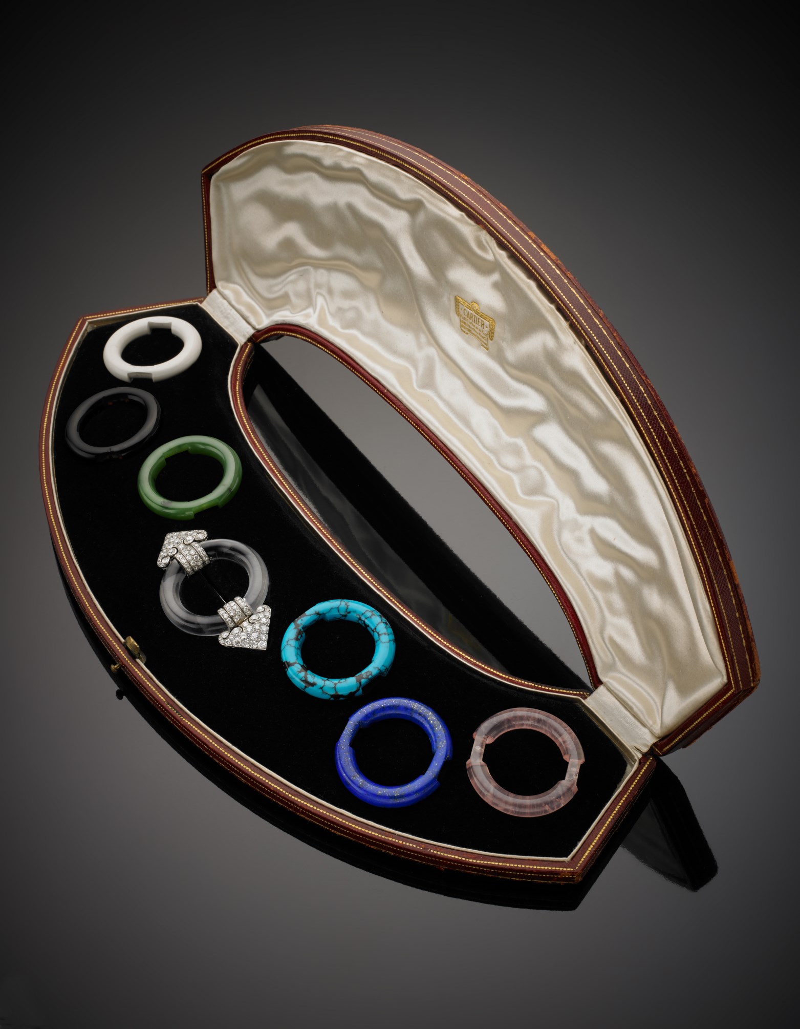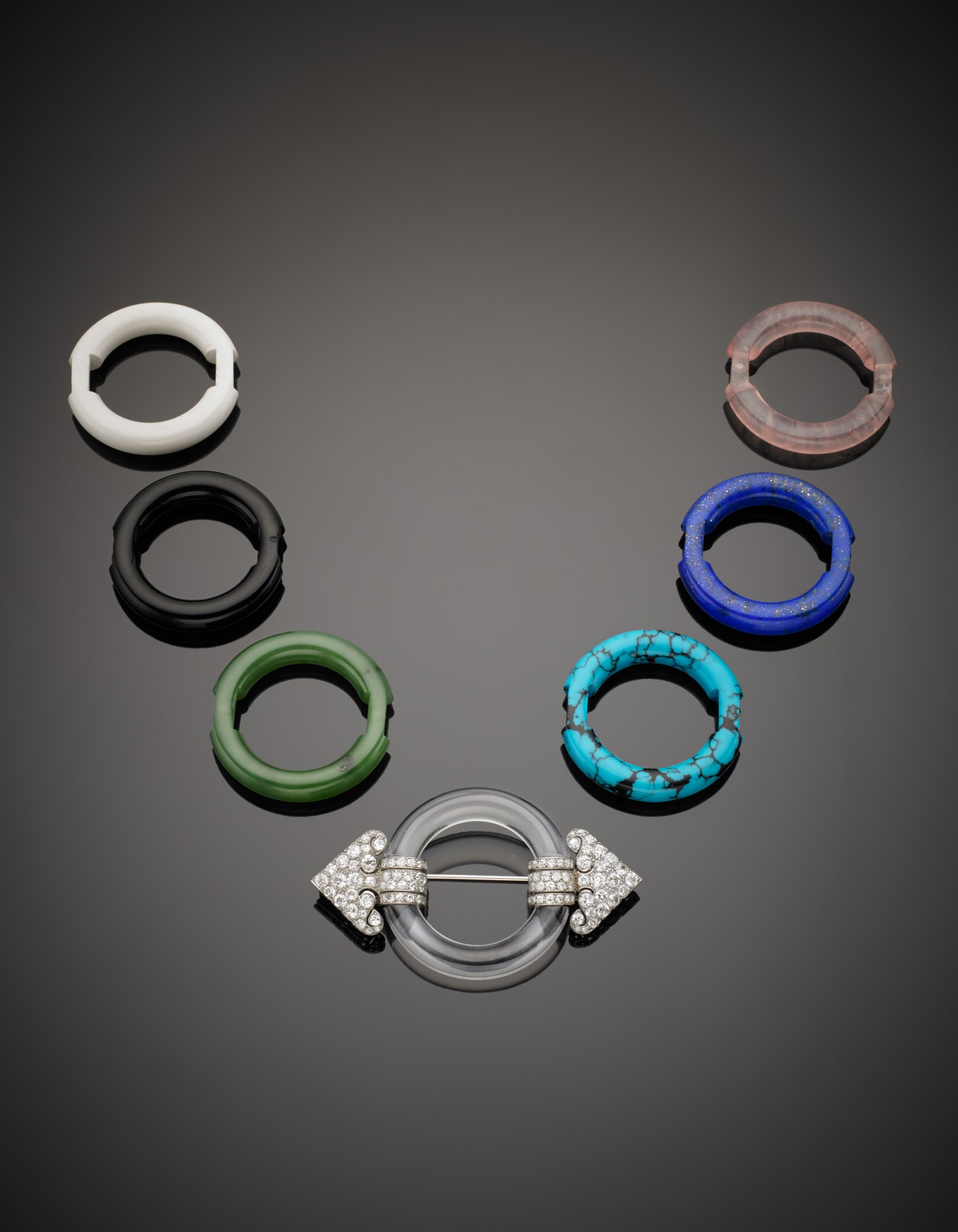 CARTIER Broche in platino con diamanti e cristallo di rocca, con set per sostituire gli anelli in cristallo di rocca con altri di differenti materiali, punzonata con testa d'aquila e di cane, CRCO1481. In scatola originale CARTIER Diamond and hyaline quartz platinum brooch with a set of ring replacements in other materials. In original case