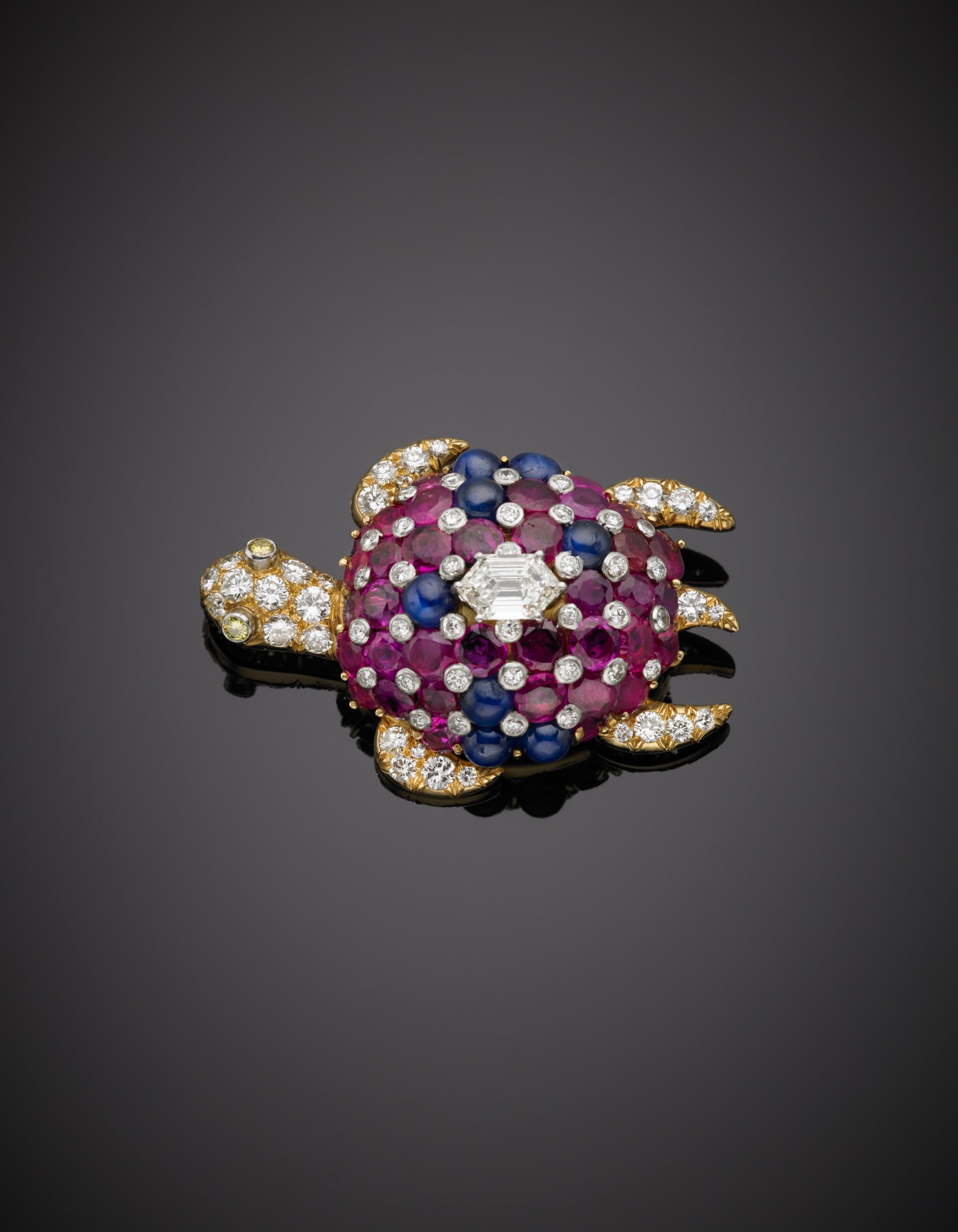CARTIER Broche a forma di tartaruga, in oro giallo e bianco, con al centro un diamante di forma fantasia, taglio a gradini di ct 1,30 circa e rifinita con rubini rotondi ed ovali, taglio composito, zaffiri rotondi cabochon ed altri diamanti, tra cui due "fancy yellow" a segnare gli occhi, g. 21,50, lungh. cm 5 circa. Firmata Cartier NY Nᄚ M 5042 CARTIER Bi-coloured gold turtle brooch with diamonds, fancy diamonds, rubies and sapphires, signed Cartier NY n. M 5042