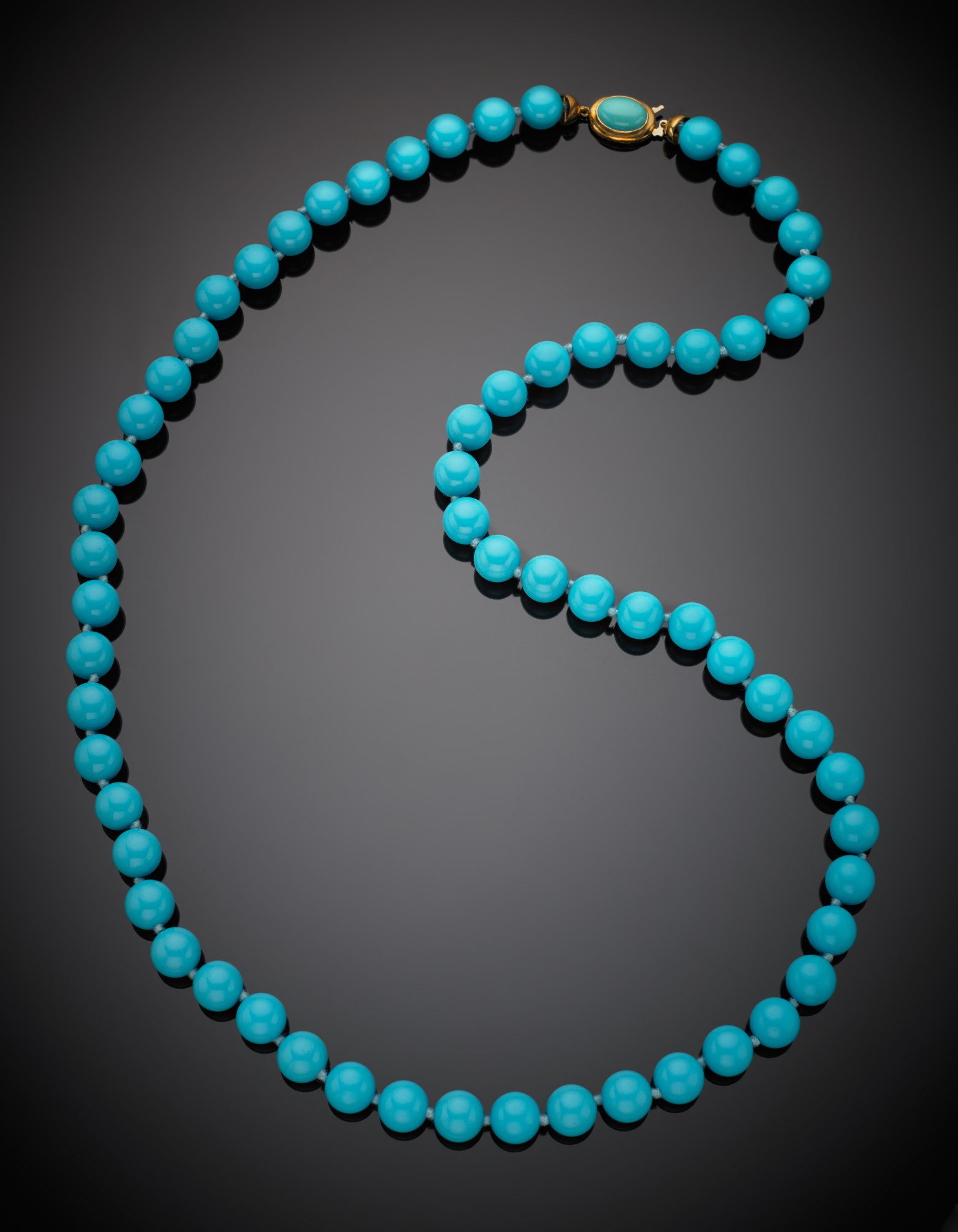 Collana di boules di pasta di turchese di mm 12 circa, lungh. cm 87, con chiusura in oro giallo con turchese cabochon ovale g. 131,40 Turqoise paste bead necklace with yellow gold clasp