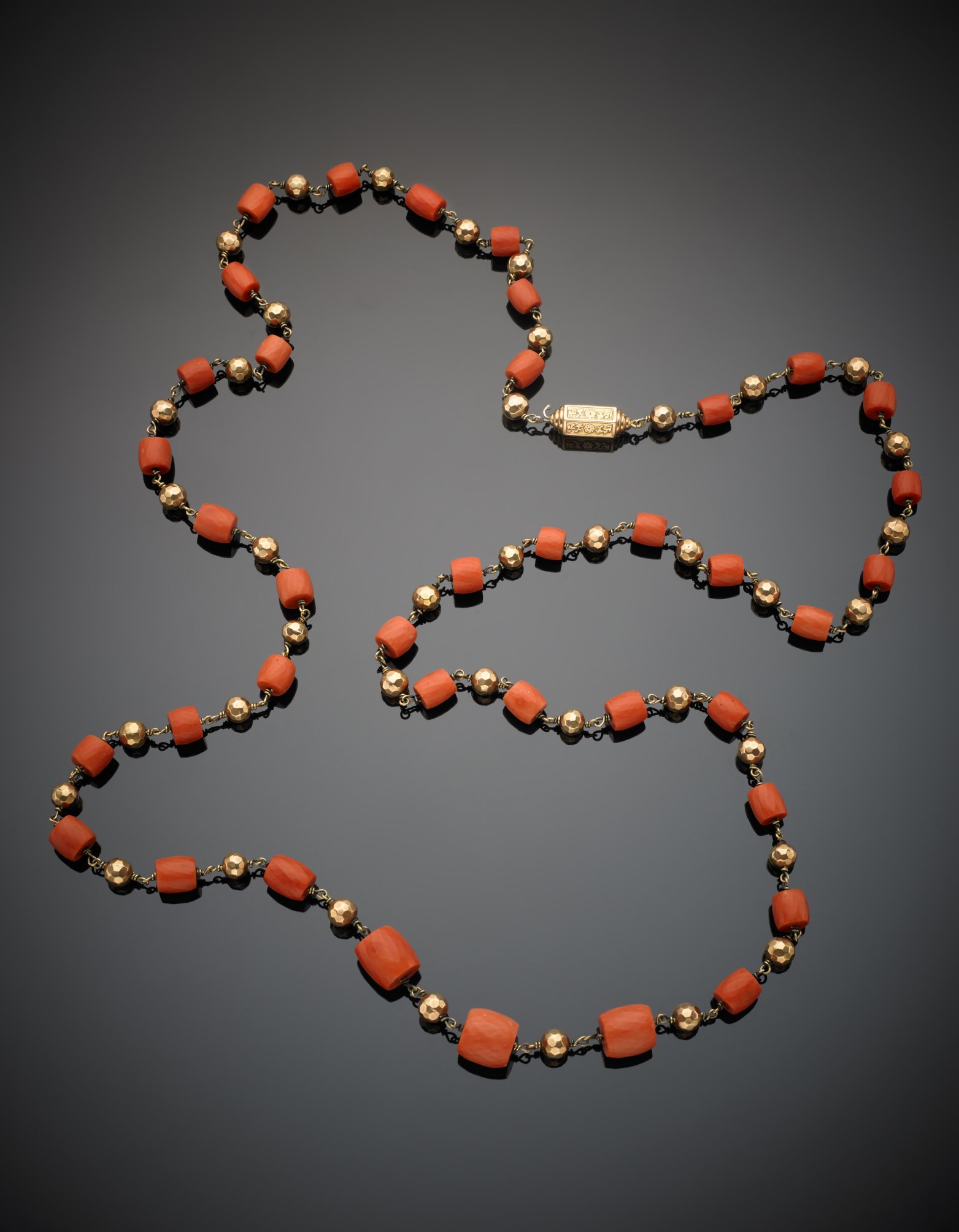 Collana in corallo rosso/arancio a barilotti sfaccettati, distanziati da boules sfaccettate in oro rosso 333/1000, g.99,60 , lungh. cm 124,50 Low carat yellow gold and red/orange mediterranean coral faceted bead necklace