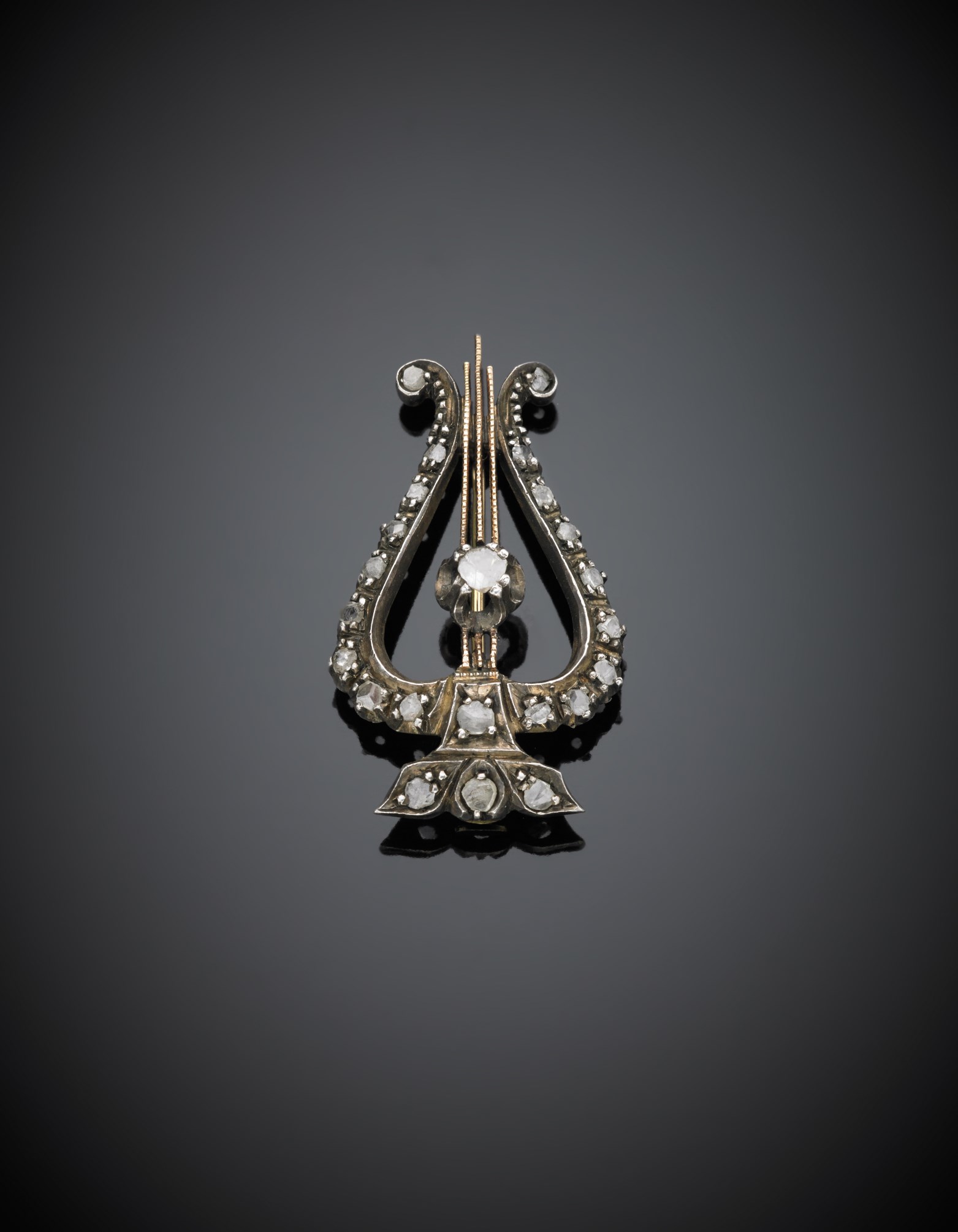 Lotto 371 | Spilla a guisa di arpa in oro giallo e argento, con diamanti irregolari g....
