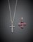 Lotto composto da due croci una in oro giallo con granati violacei rotondi e l'altra in oro bianco con catenina e diamanti, complessivi g. 8 Lot comprising two crosses, one in gold with garnets the other in white gold and diamonds with chain