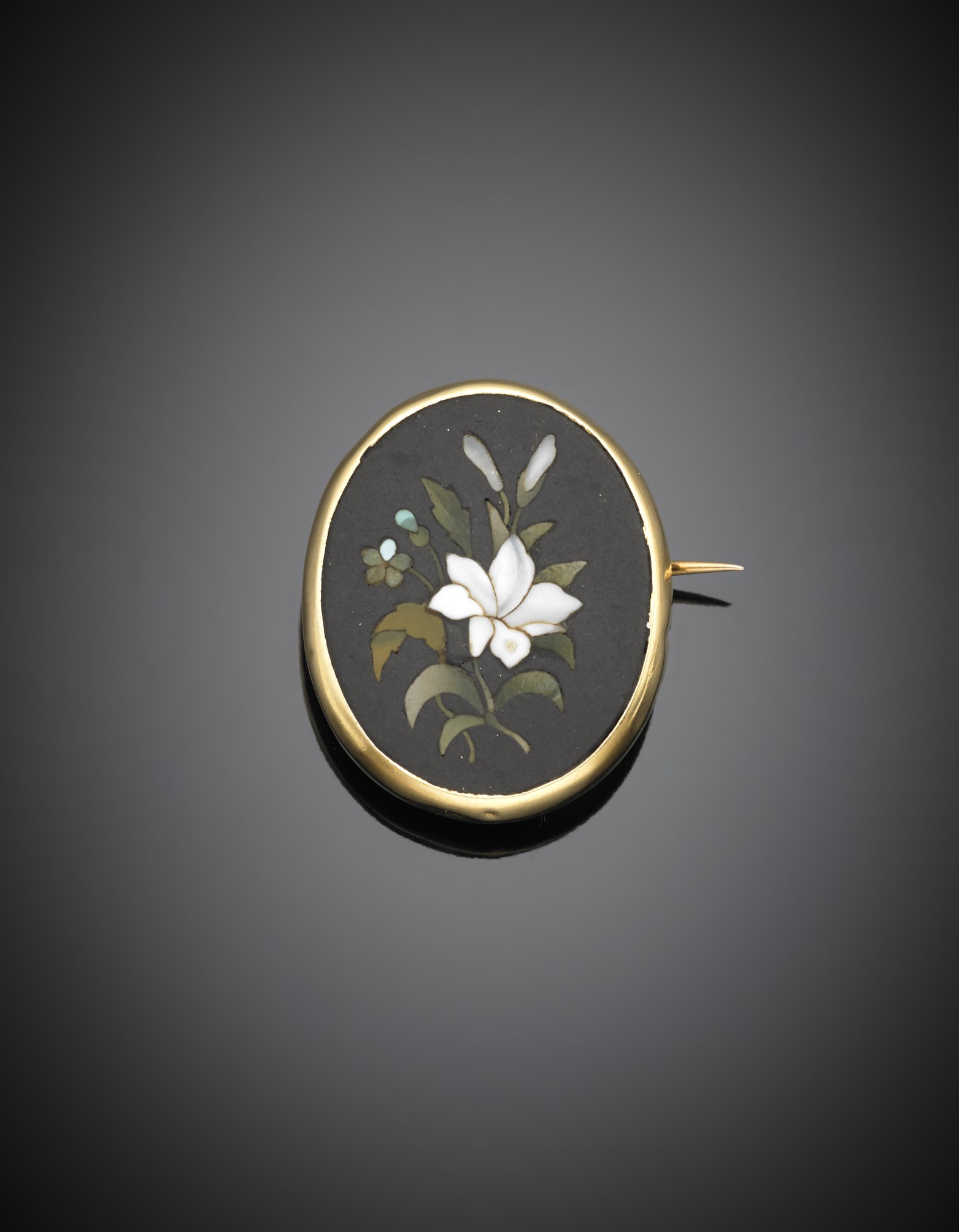 Spilla in oro giallo e mosaico di pietre dure raffigurante un giglio, g.11,70...