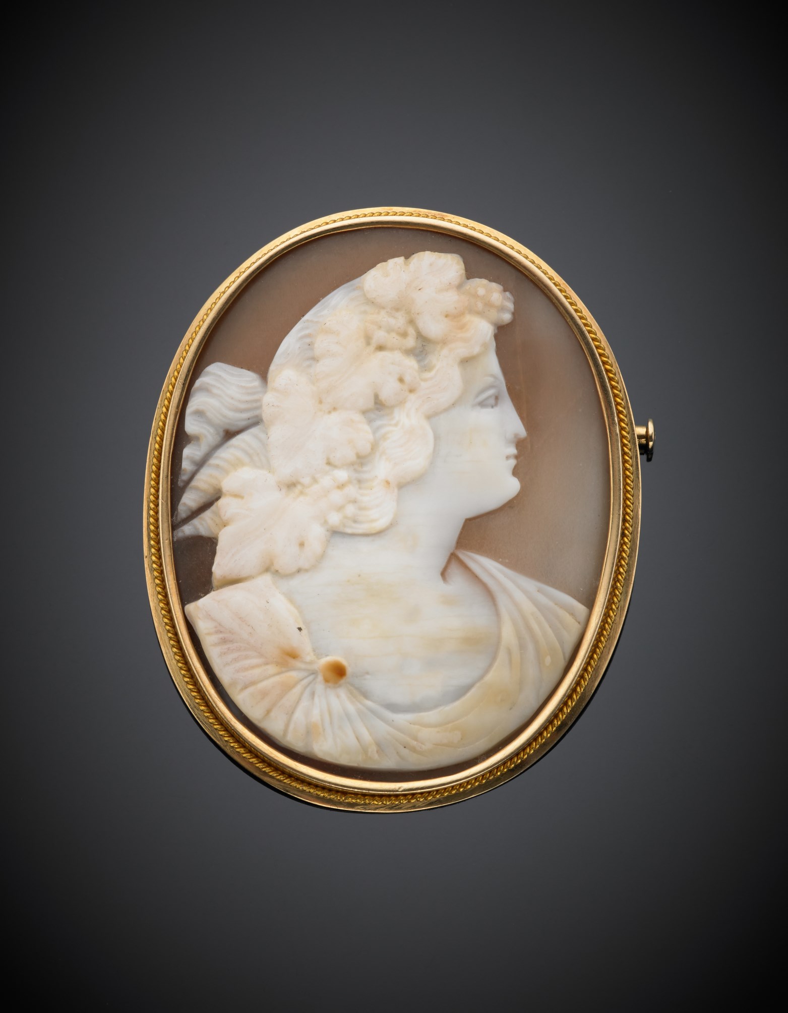 Spilla con grande cammeo in oro giallo a figura di donna g. 17,70 cm 6x5...