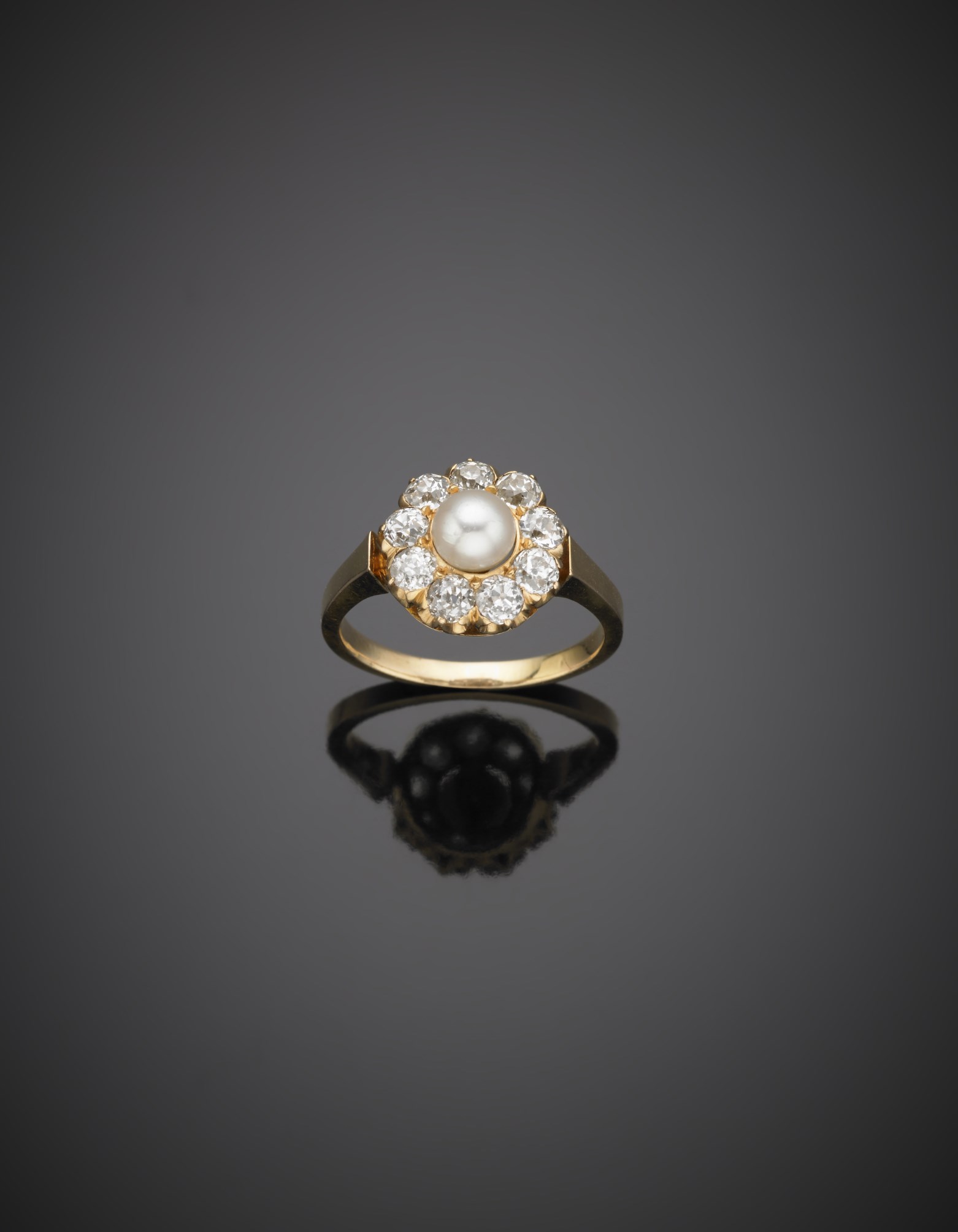 Anello in oro rosso con nove diamanti old mine ed al centro una perla...