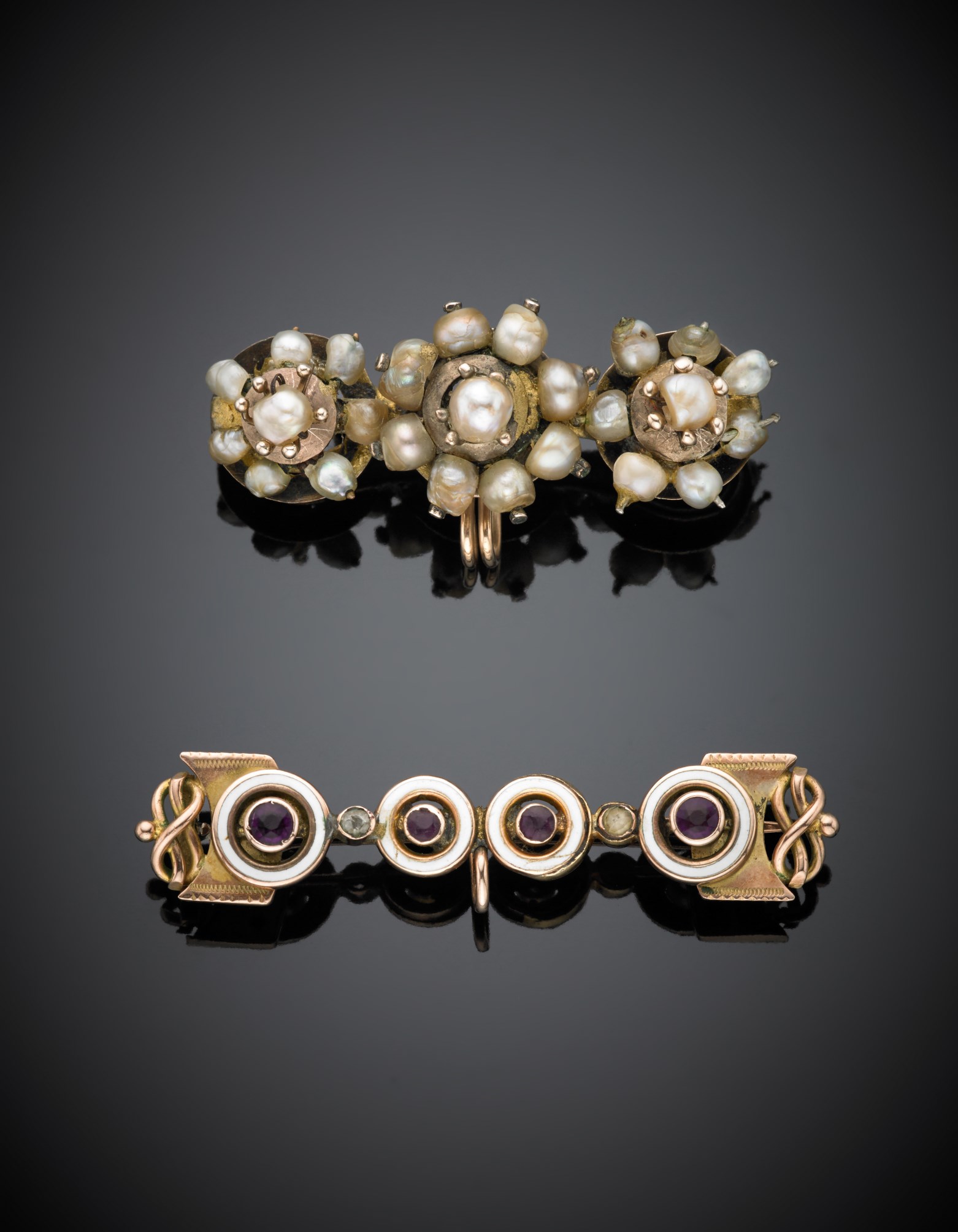 Lotto di due spille in oro giallo rossastro una con smalto bianco e ametiste oro 750/1000 l'altra con perle irregoalri in oro 333/1000 complessivi g. 12,90 Lot comprising a 9 k and an 18 k gold brooch