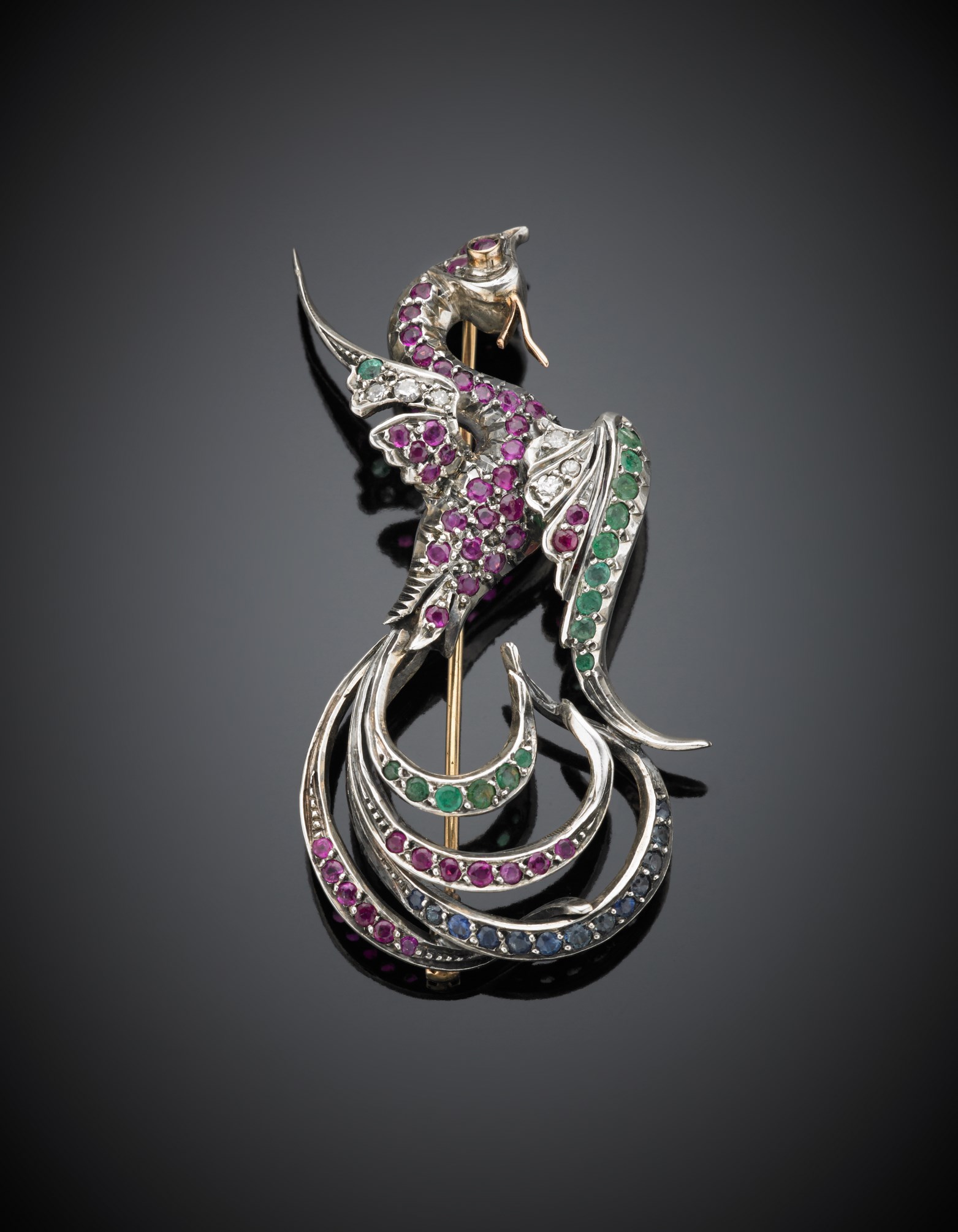 Spilla a guisa di uccello del parardiso in oro giallo e bianco con diamanti rubini smeraldi e zaffiri, g. 15,50, lungh. cm 6 Diamond, ruby, emerald and sapphire bi-coloured gold bird of paradise brooch