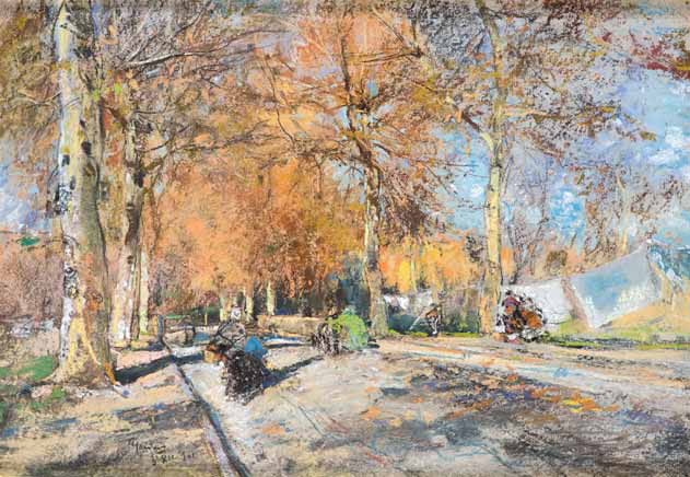 Giuseppe Casciaro Ortelle 1863 – Napoli 1945 Viale d’autunno, 1901 pastelli su cartoncino, cm 28x40,5. Firmato e datato in basso a sinistra: G Casciaro 3 XII 901. Timbro al retro: G. Casciaro Napoli. Provenienza: Milano, Enrico Galleria d’Arte, n. 99/117 Milano, Sotheby’s, 5 dicembre 2005, lotto n. 77 Milano, Collezione privata