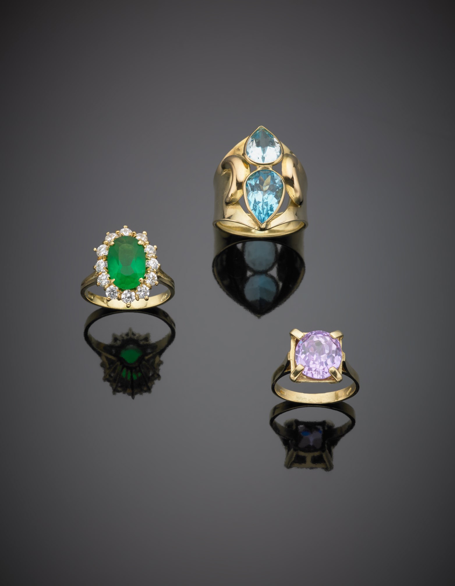 Lotto composto da tre anelli in oro giallo con due topazi azzurri a goccia e...