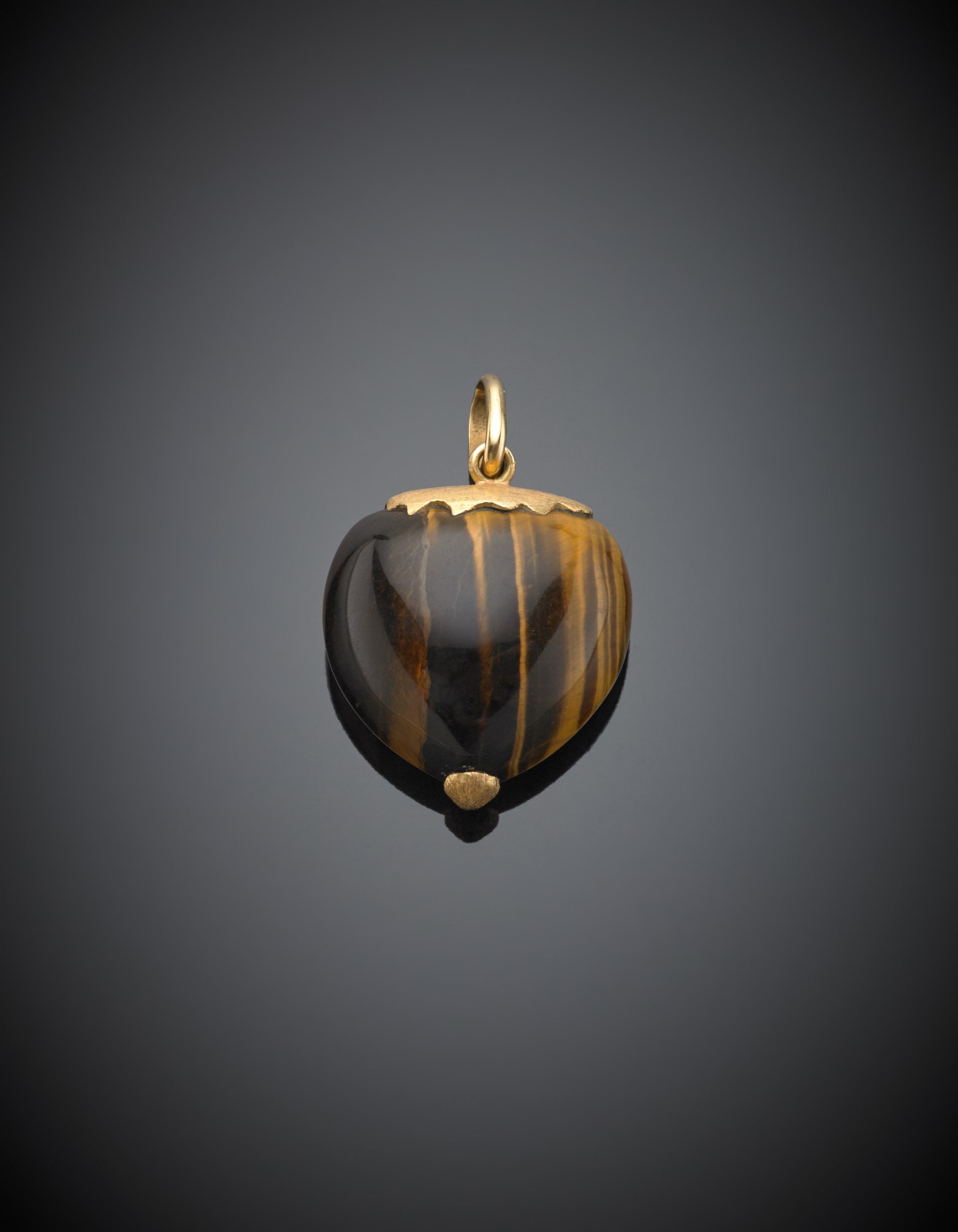 Pendente a guisa di castagna in occhio di tigre montato in oro giallo, g. 12, largh. 2,30 Tiger's eye and gold chestnut pendant
