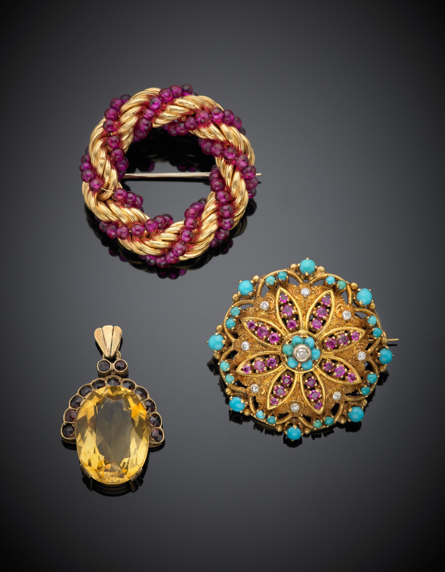 Lotto composto da due spille e un ciondolo in oro giallo, rubini, turchesi, granati e un quarzo citrino, g. 30,80 Lot comprising two brooches and a small ruby, turquoise, garnet and quartz gold pendant