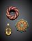 Lotto composto da due spille e un ciondolo in oro giallo, rubini, turchesi,...