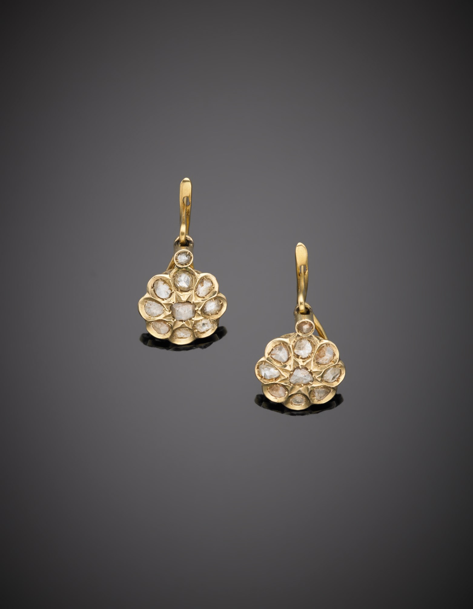 Orecchini pendenti in oro giallo con diamanti irregolari taglio mezza rosetta g. 5,60 Gold and diamond ear pendants