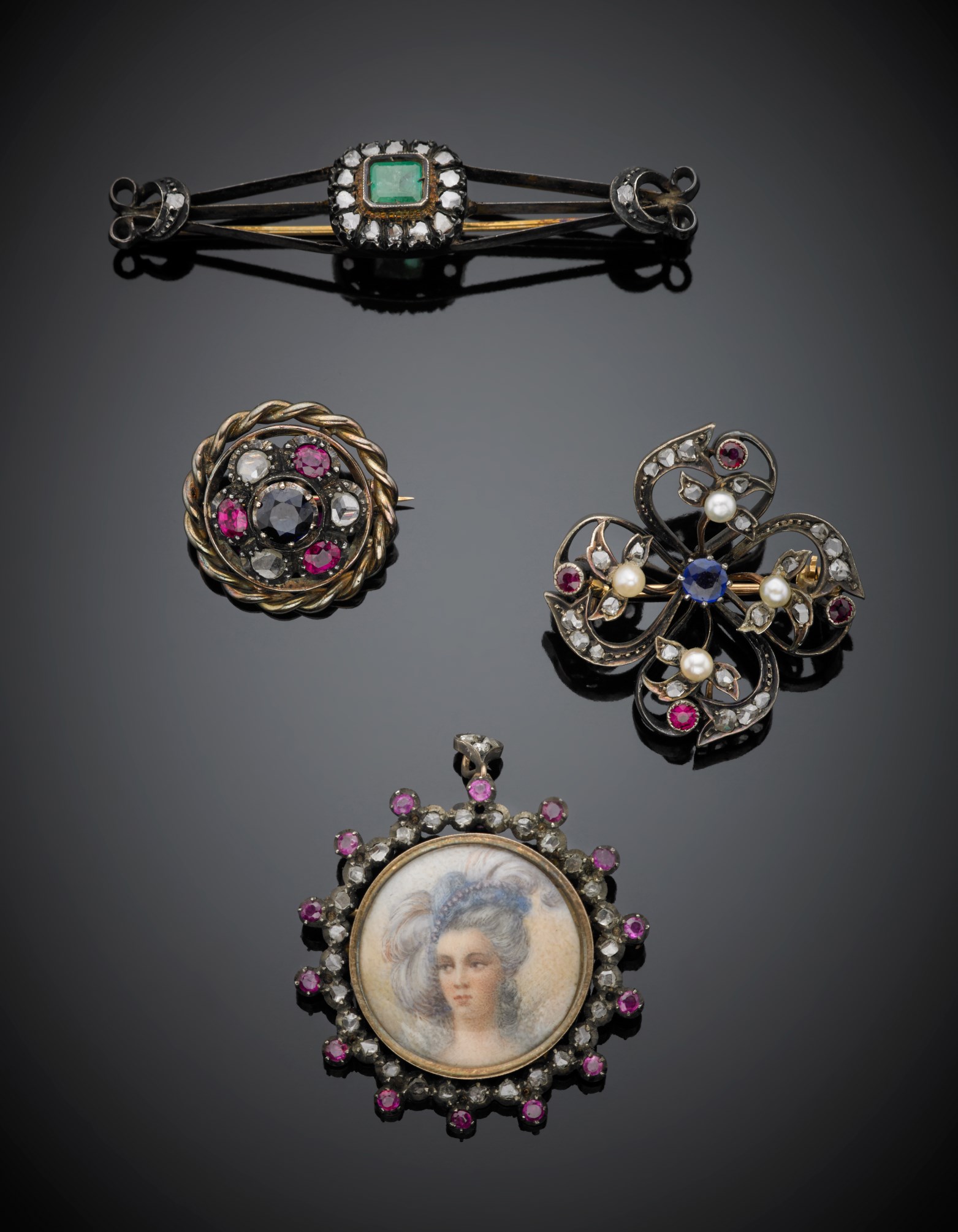 Lotto composto da quattro spille in oro giallo e argento diamanti e gemme preziose varie, una con miniature, due reversibili a pendente, complessivi g. 36,80 Lot comprising four diamond and multi gem gold and silver brooches