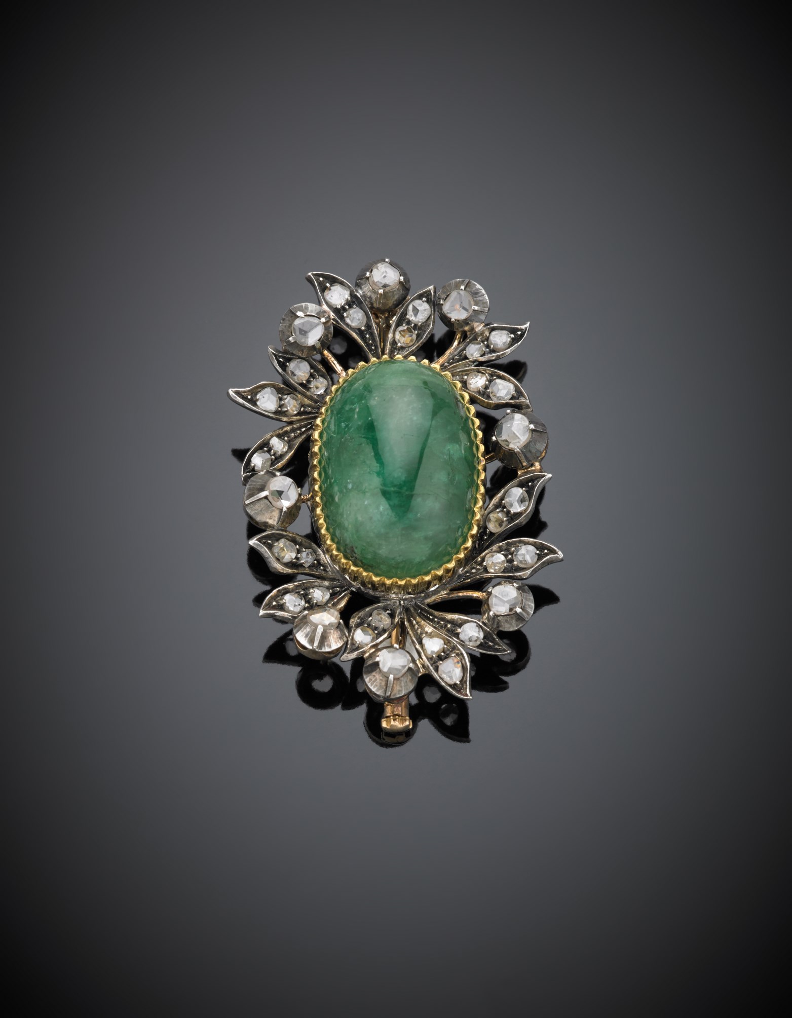 Spilla in oro giallo e argento con smeraldo cabochon di ct. 24,00 circa e diamanti irregolari taglio mezza rosetta, g. 18,90, largh. cm 4,50 Emerald and diamond, gold and silver brooch