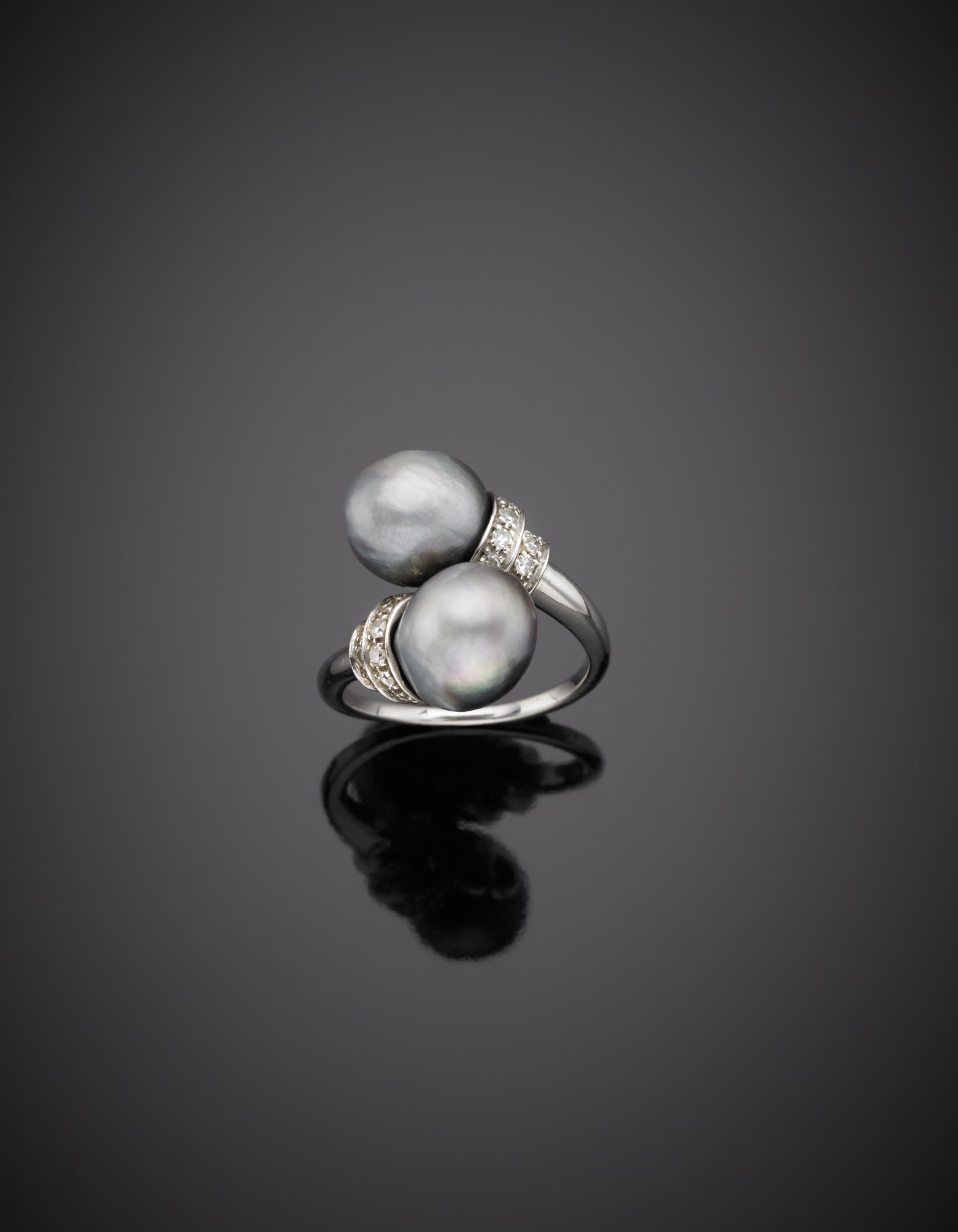 Anello contrariè in oro bianco ornato da due perle grigie di mm. 9,70 circa arricchite da due file di piccoli diamanti g. 7,80 misura 12/52 A pearl and diamond white gold ring