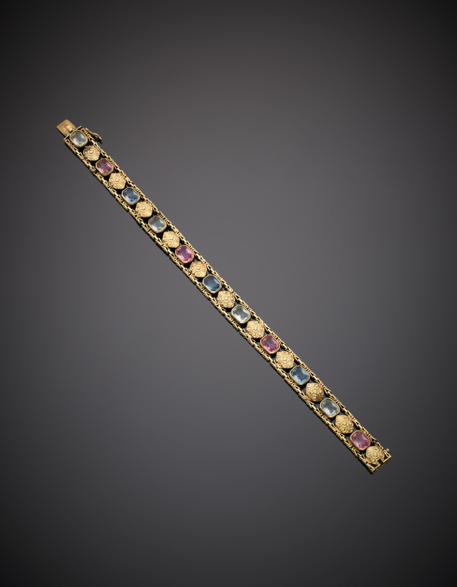 Bracciale in oro giallo a moduli sbalzati alternati a pietre di tre diversi...