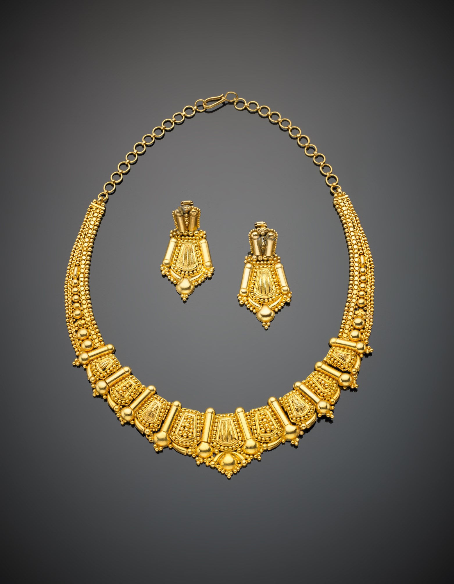 Demiparure "indiana" in oro giallo 916/1000: collier ed orecchini g.43,00 lungh.collier cm 36,00, lungh. orecchini cm 4,4 circa An "Indian" set of gold jewelley comprising a necklace and earrings