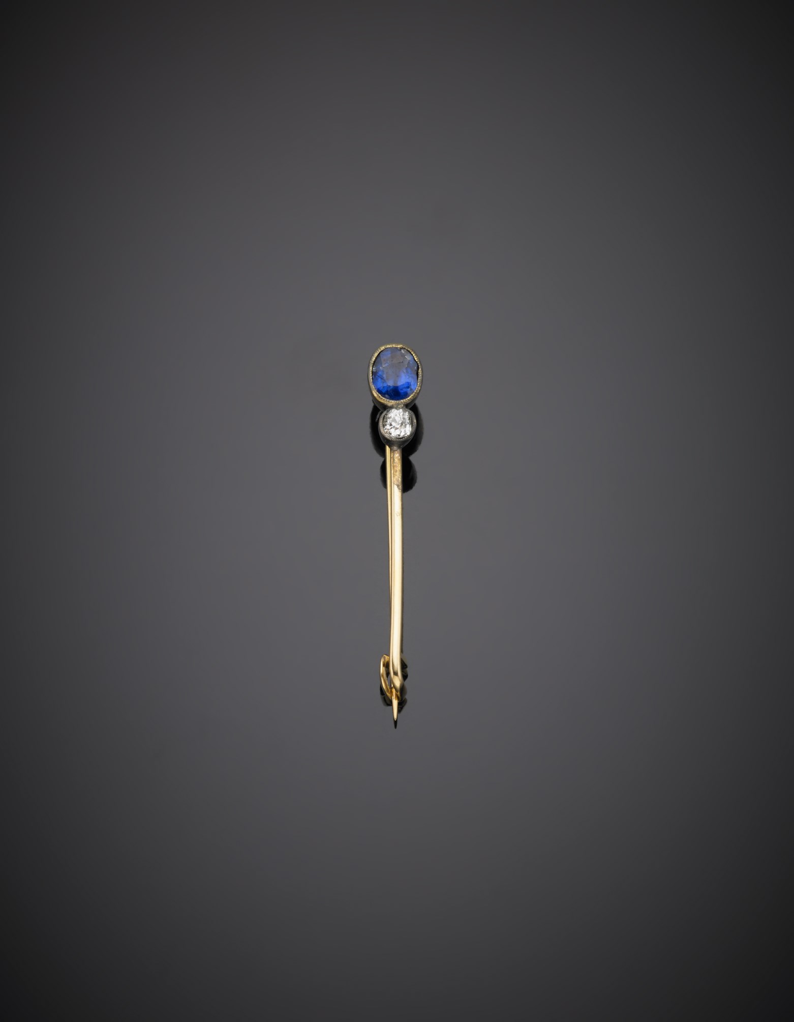 Spillone in oro giallo e argento con zaffiro ovale e diamante rotondo g. 1,70 A sapphire and diamond gold and silver pin