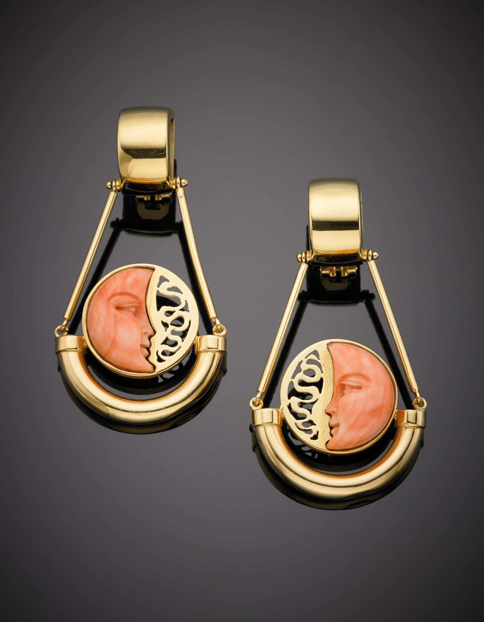 Orecchini pendenti in oro giallo con corallo rosa a guisa di mezza luna, g.24,80, lungh. cm 6,30 circa Gold and pink coral ear pendants