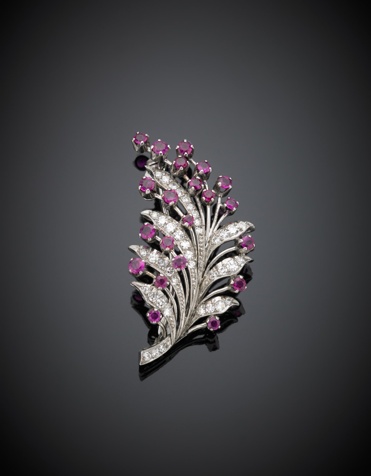 Lotto 484 | Spilla floreale in oro bianco con diamanti e rubini g. 9,20 lungh. cm 5...