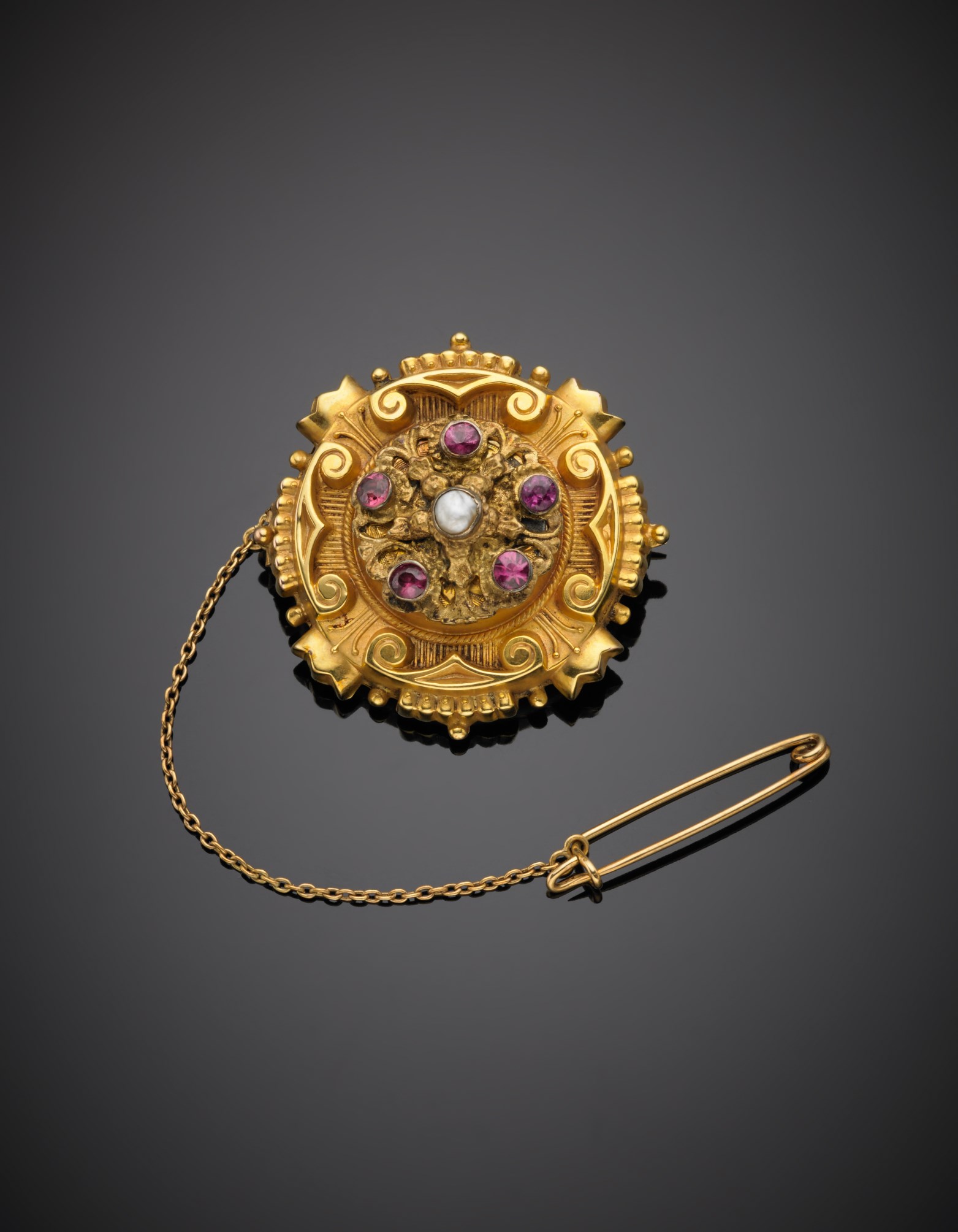 Spilla inglese rotonda con portafoto in oro giallo rossastro 333/1000, rubini rotondi e perla centrale rifinita con catenina e spilla da balia, complessivi g. 8,80 An English low carat gold locket with chain and safety pin