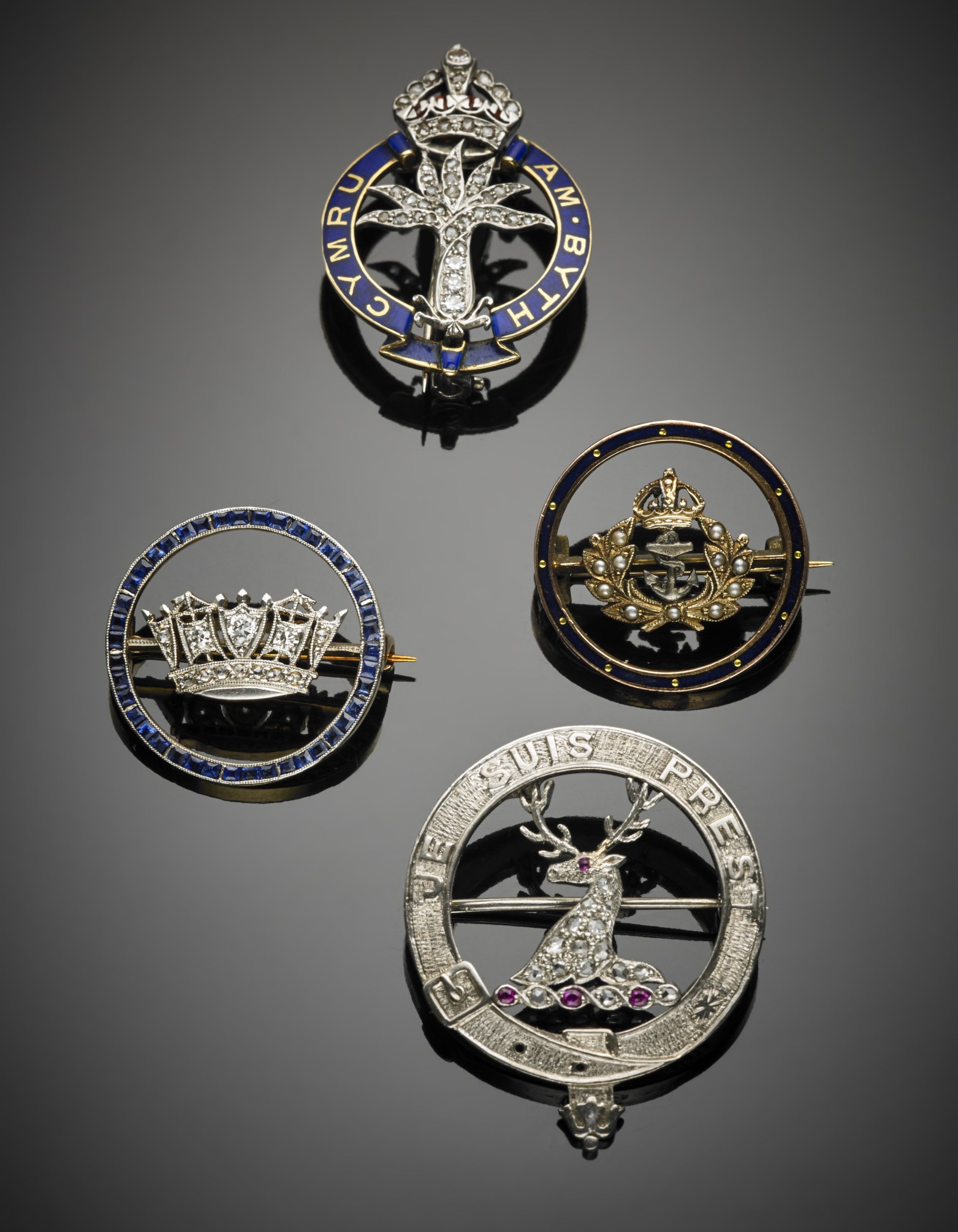 Lotto di quattro spille in oro giallo e bianco con diamanti, gemme varie e smalti g.19,10 Lot comprising four golden brooches with diamonds, gems and enamel