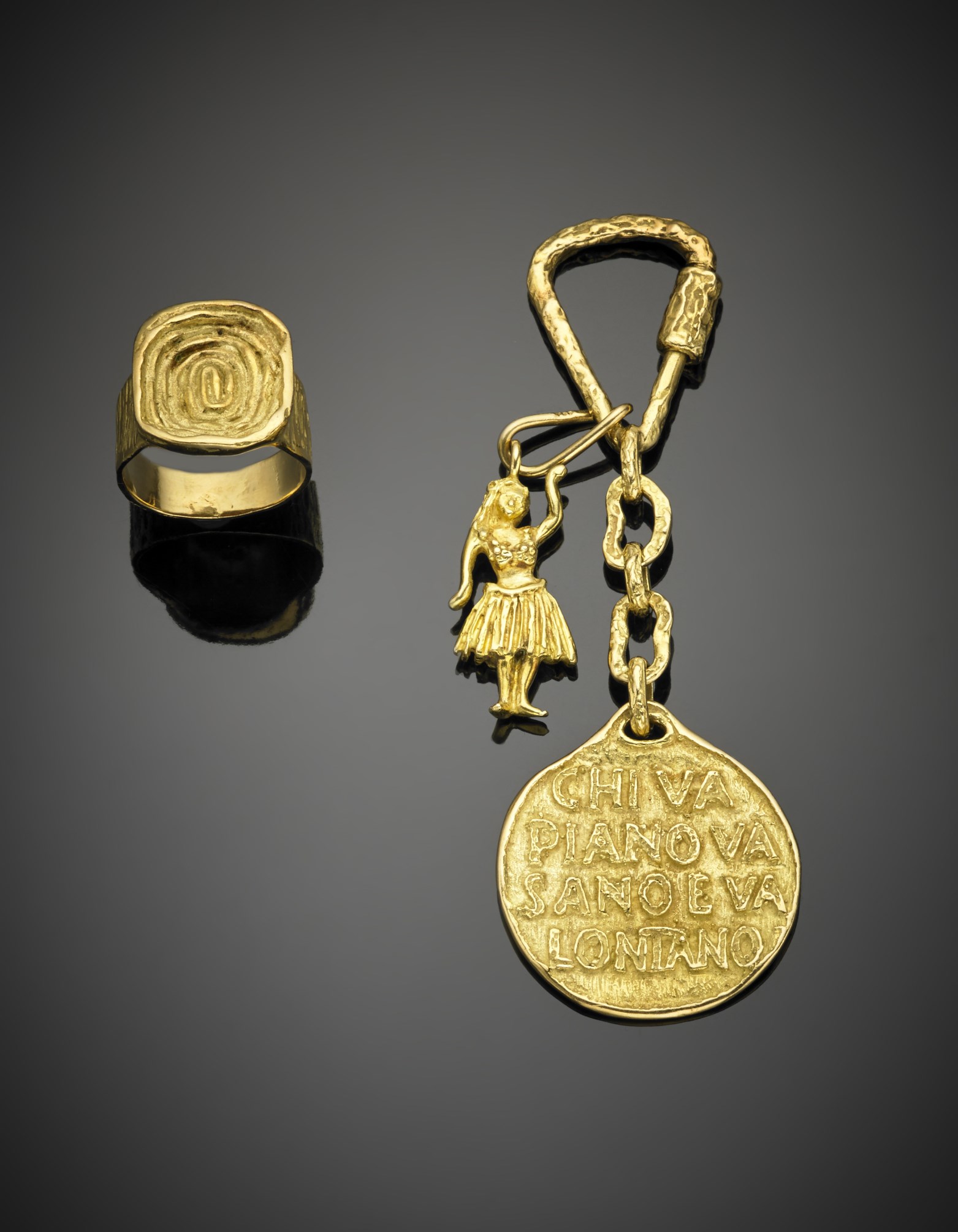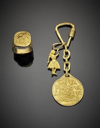 Portachiave ed anello in oro battuto e striato, nel portachiavi in rilievo la scritta "Chi va piano va sano e va lontano", ed appeso un charms di donna havaiana, complessivi g. 54,50, anello misura 22/62 Lot comprising a gold key-ring and a ring