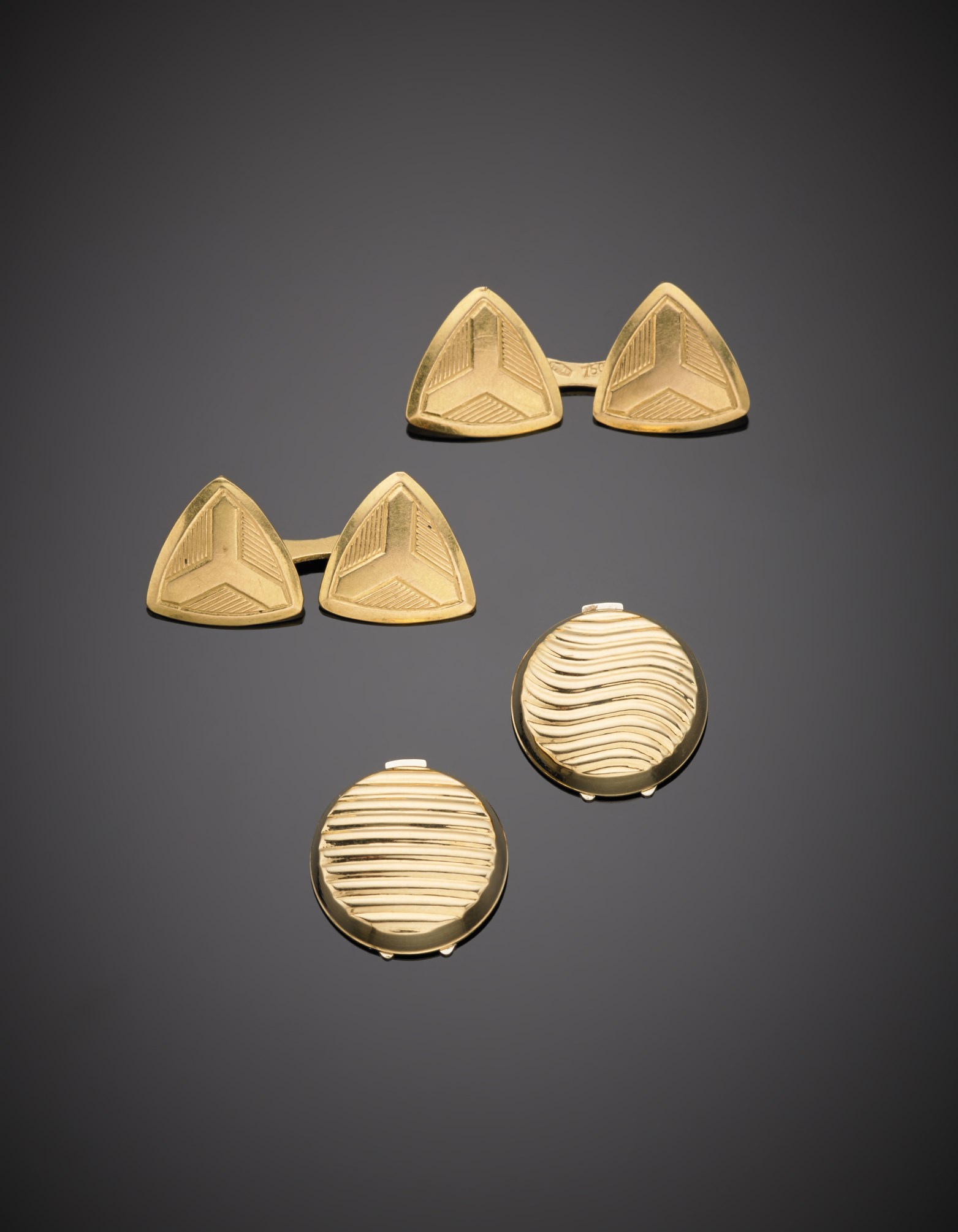 Lotto composto da un paio di gemelli e un paio di bottoni in oro giallo, i primi a scudo, i secondi rotondi e rigati, complessivi g. 10,10 Lot comprising a pair of gold cuff-links and a pair of gold buttons