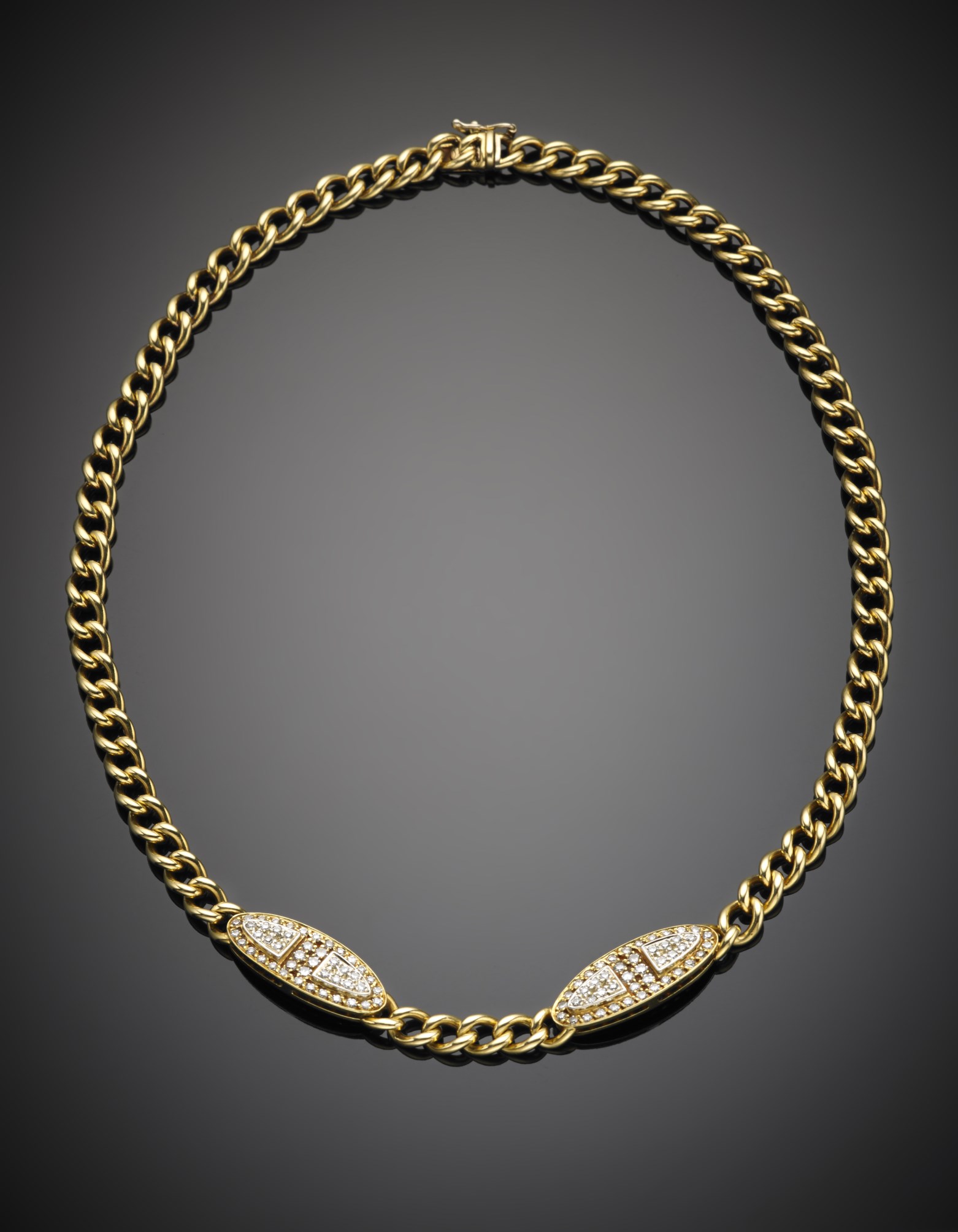 Collier in oro giallo maglia groumette, al centro due ovali con pavè di diamanti g. 44,1, lungh. cm 39 A gold link chain necklace centered by two diamond-set ovals